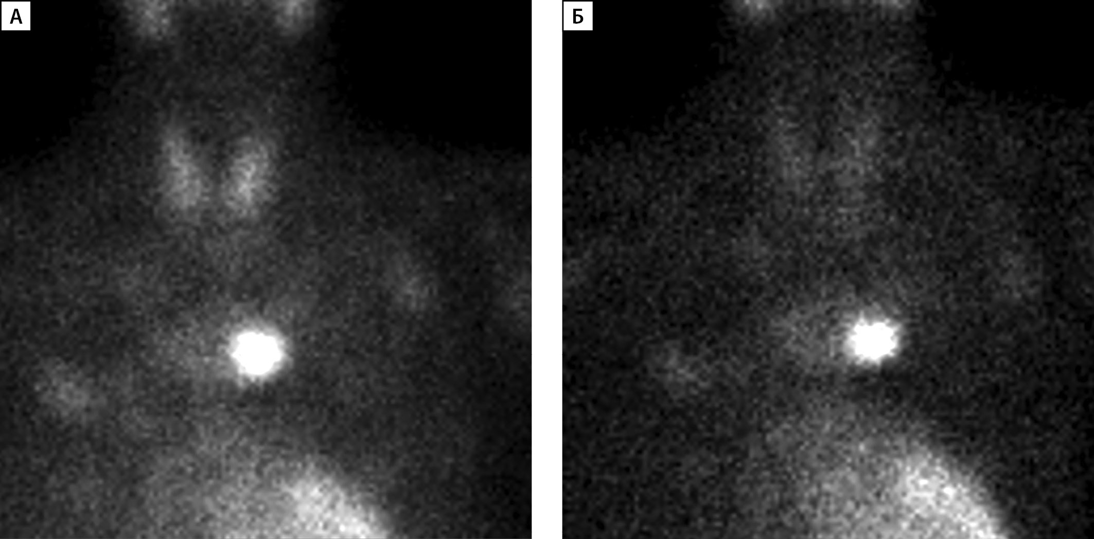 3. Рисунок 3 (А, Б). Планарная сцинтиграфия образования околощитовидной железы, эктопированного в средостение. А — Через 15 минут после введения контраста; Б — через 90 минут после введения контраста.