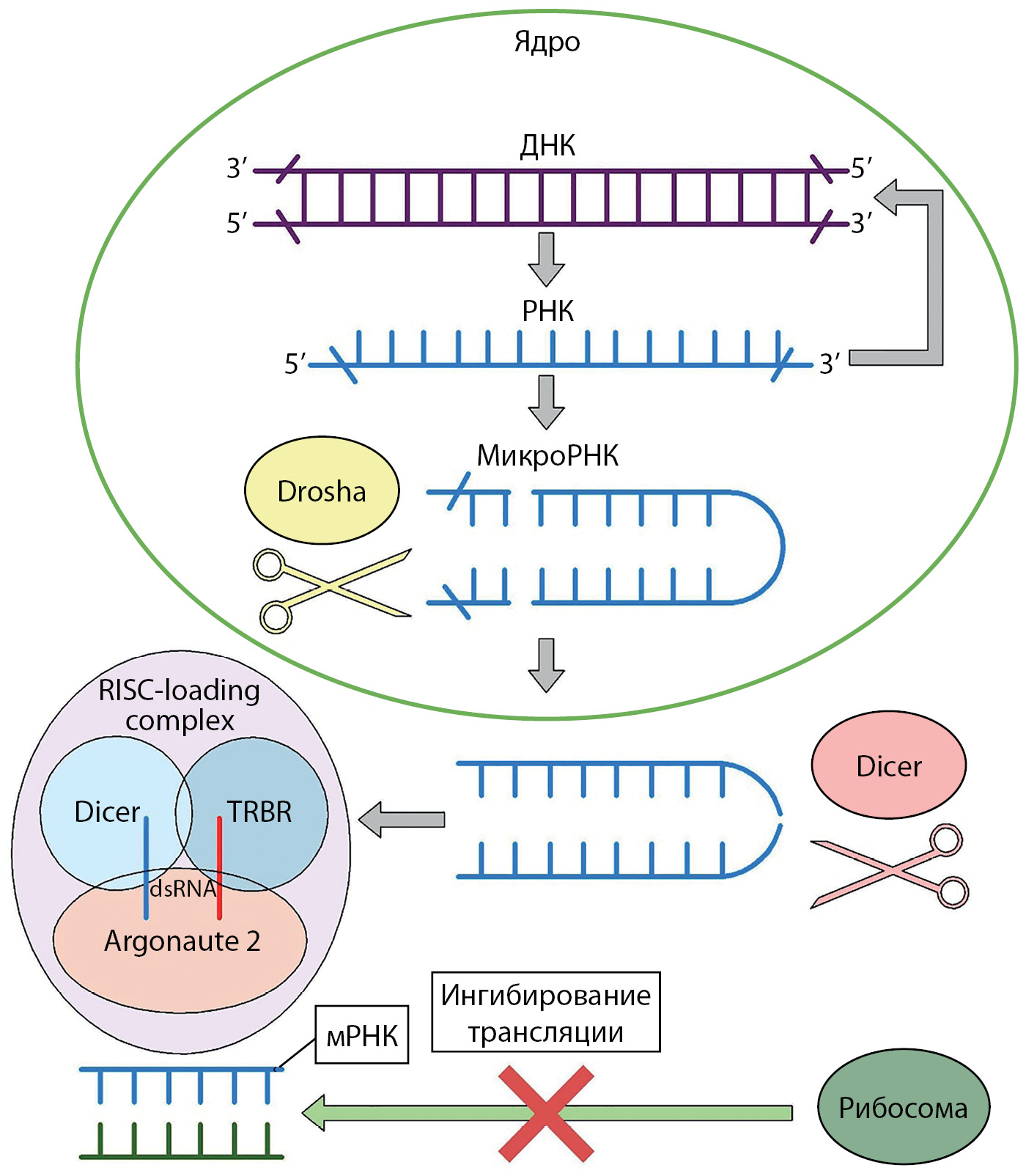 Цитоплазматический аналог фермента Drosha, РНКаза III Dicer осуществляет процессинг премиРНК с образованием дуплексов микроРНК (д-миРНК), состоящих из 18–22 нуклеотидов. В дальнейшем дуплекс микроРНК участвует в создании РНК-индуцированного комплекса выключения белка (RISK, RNA-induced silencing complex), представляющего собой сложную структуру, которая состоит из белков семейства Argonaute (AGO), РНК-связывающего белка трансактивационного ответа (TARBP2) и РНКазы III Dicer [9]. Данный комплекс, взаимодействуя с некодирующим участком 3’-конца матричной РНК (мРНК), приводит к предотвращению ее трансляции или полной деградации молекулы [10] (рис. 1).