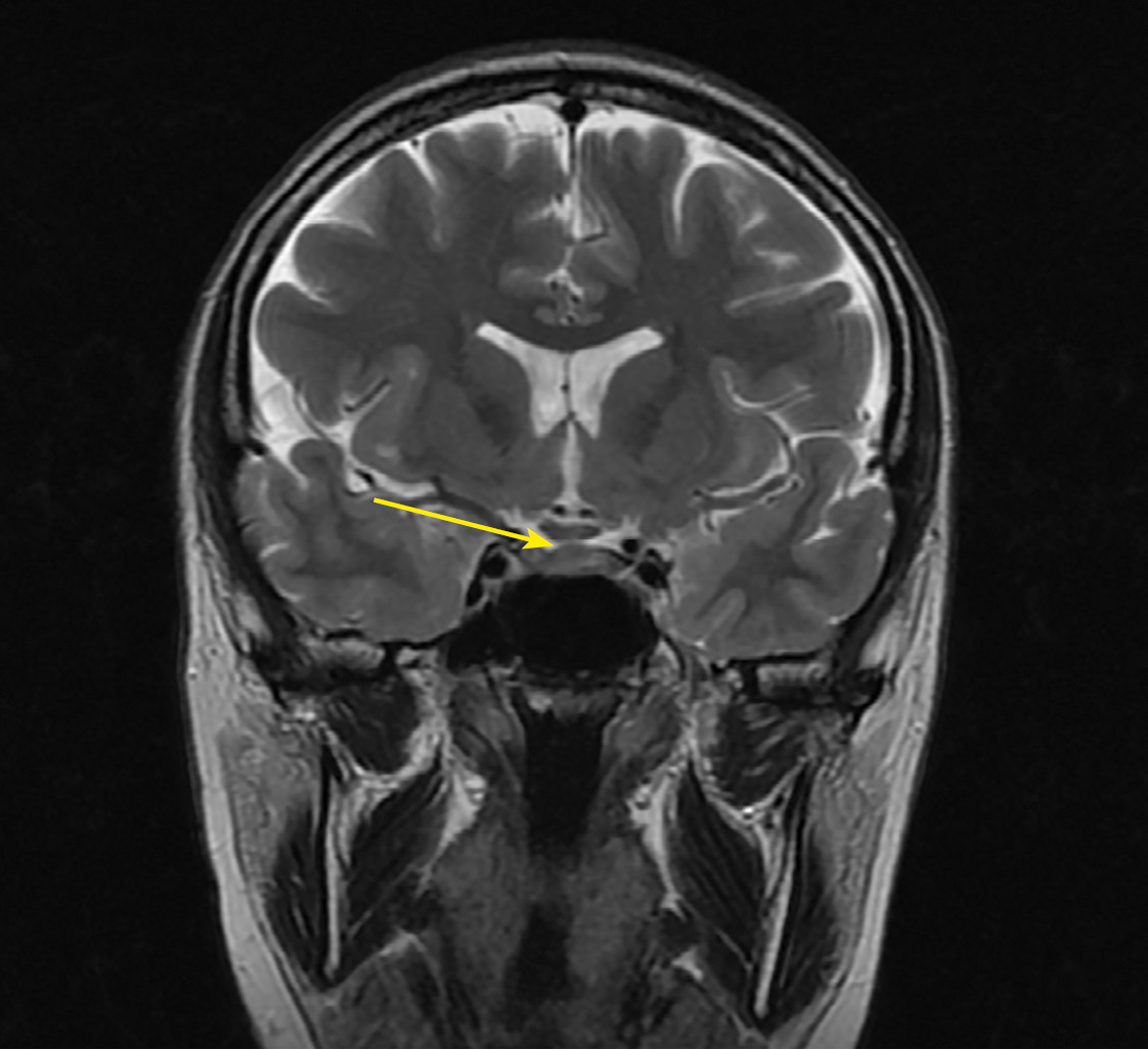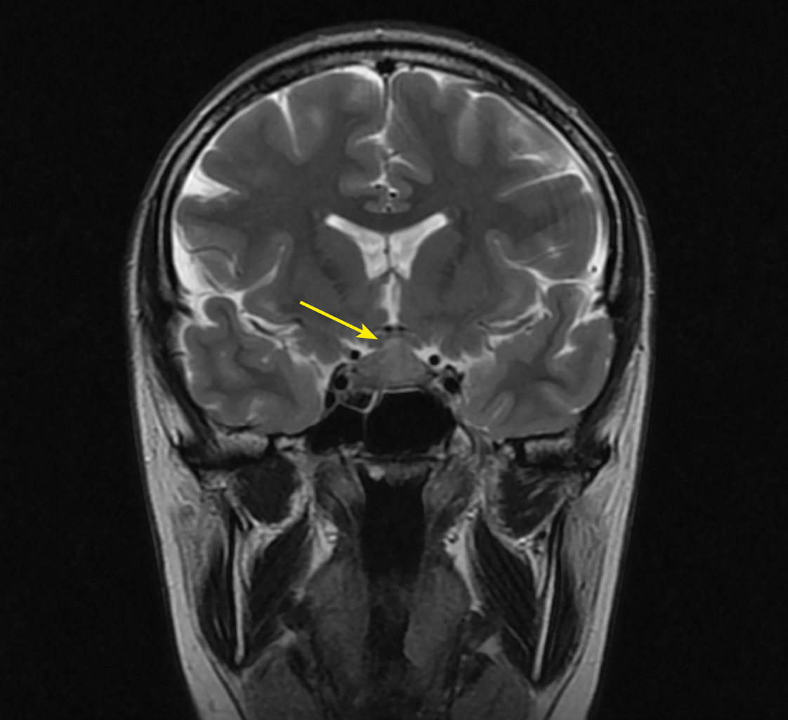 3. Рисунок 3. МРТ головы без контрастного усиления, Т2-взвешенное изображение, коронарная (фронтальная) проекция. Сохраняется утолщение ножки гипофиза (изменения указаны стрелкой).