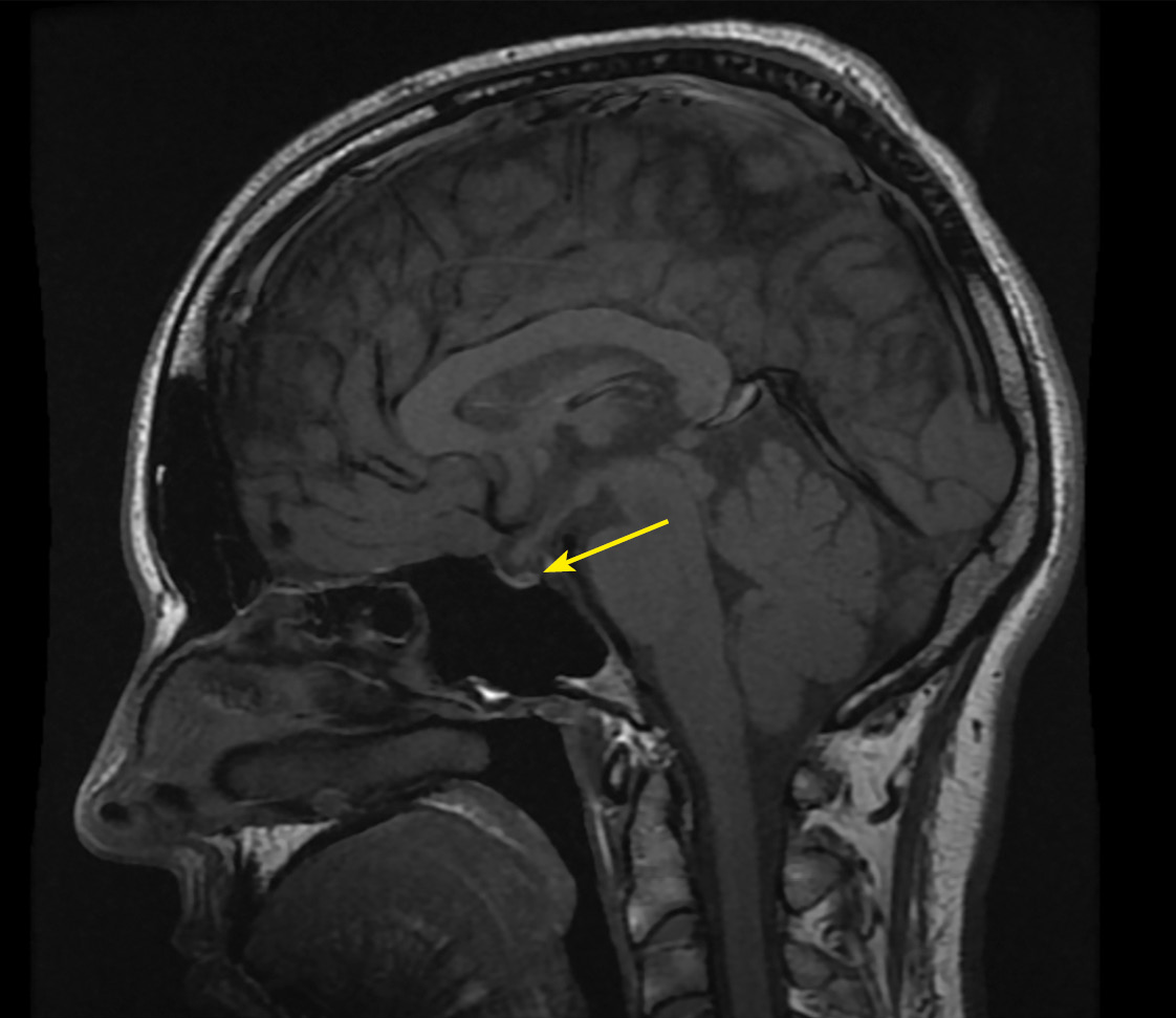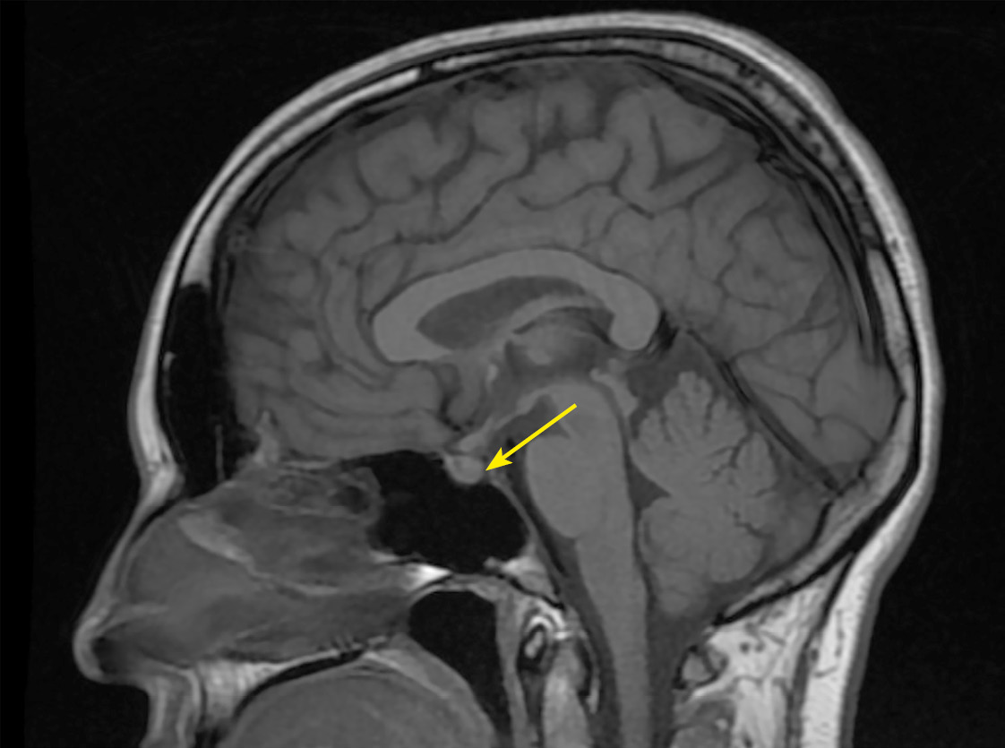 4. Рисунок 4. МРТ головы без контрастного усиления, Т1-взвешенное изображение, сагиттальная проекция. Нейрогипофиз не дифференцируется (изменения указаны стрелкой).