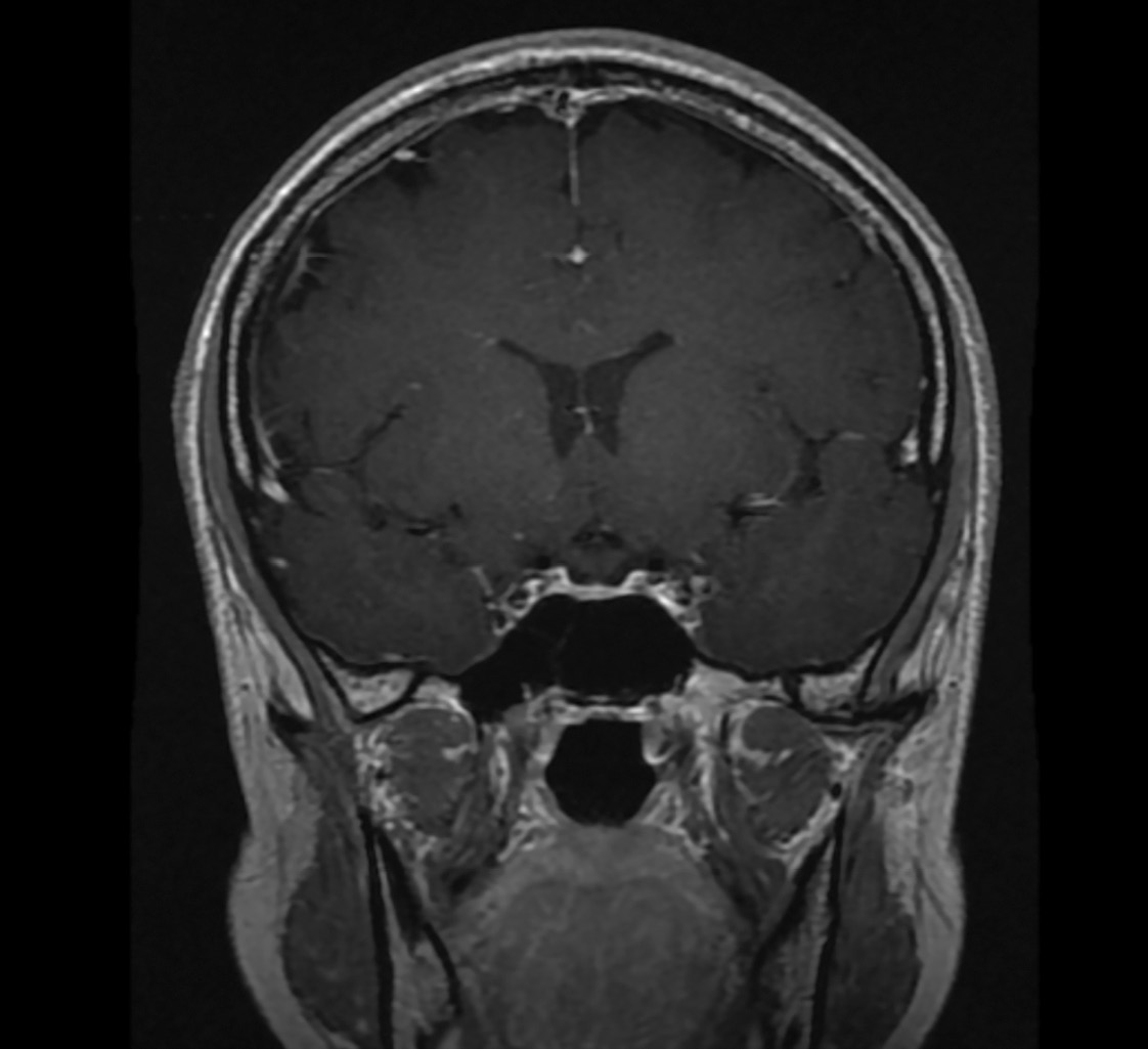 5. Рисунок 5. МРТ головы с контрастным усилением, Т1-взвешенное изображение, коронарная (фронтальная) проекция. МР-картина частично «пустого» турецкого седла.