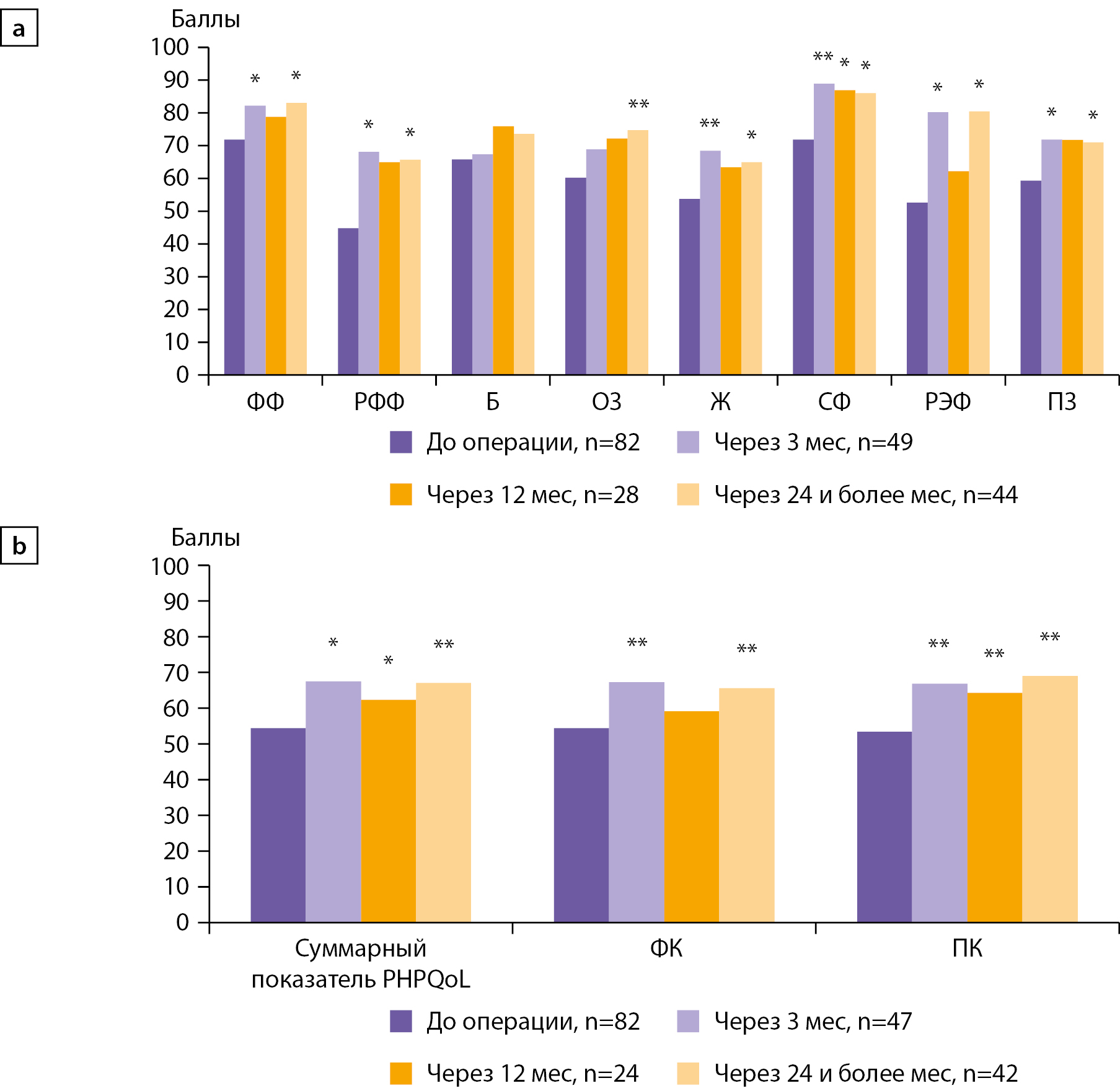 Рисунок 1. Скорректированные по возрасту, форме ПГПТ (манифестная или бессимптомная), уровню гиперкальциемии (легкая или умеренная/тяжелая), а также исходному качеству жизни средние показатели по шкалам опросника SF-36 (а) и по суммарному показателю, ФК и ПК опросника PHPQoL (б) у больных ПГПТ до операции, через 3, 12, 24 и более мес после операции; *p<0,05; **p≤0,001.