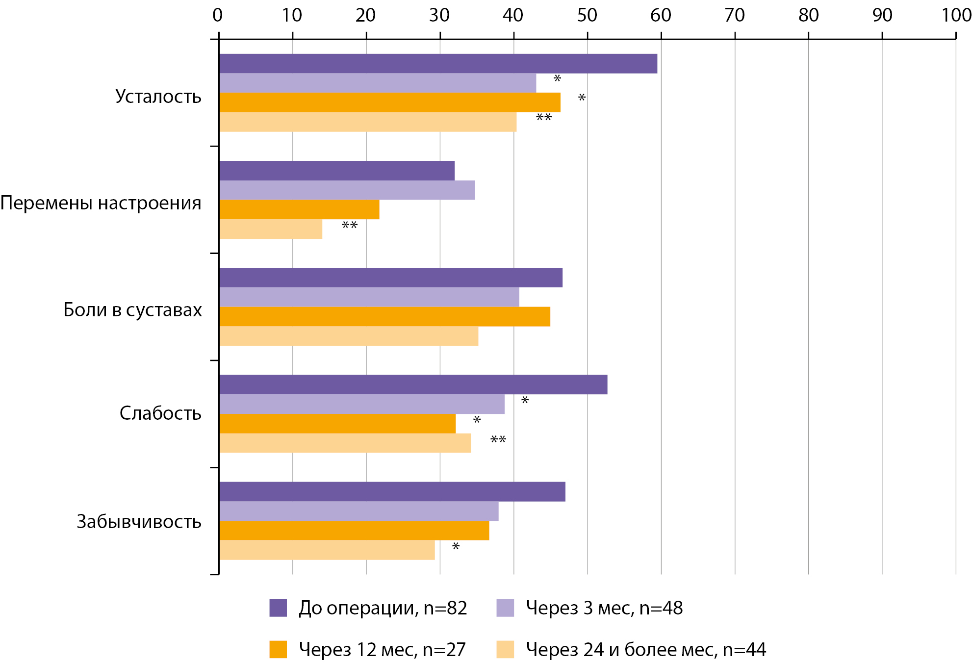 До операции актуальными симптомами, которые встречались у более половины пациентов и имели выраженную интенсивность (40–100 баллов), являлись усталость (80%), слабость (64,6%), забывчивость (60,9%), боли в суставах (58,0%), и перемены настроения (50,1%). В разные сроки после операции происходило снижение выраженности данных симптомов (рис. 2).