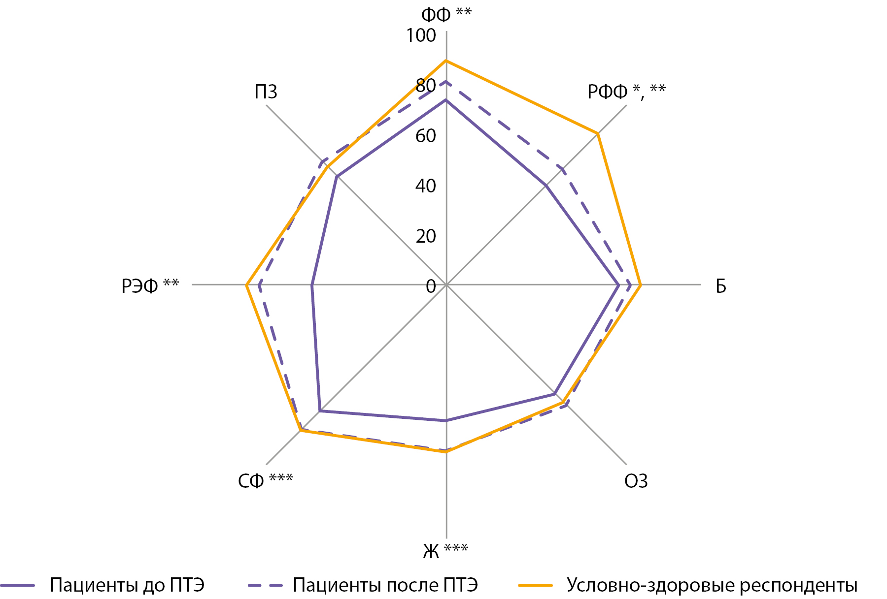 Рисунок 3. Средние показатели по шкалам SF-36 у пациентов до и после ПТЭ в сравнении с условно-здоровыми респондентами; *p=0,011 для сравнения показателей в отдаленные сроки после ПТЭ с показателями условно-здоровых респондентов; ** p<0,001, *** p<0,05 для сравнения показателей до операции с показателями условно-здоровых респондентов.