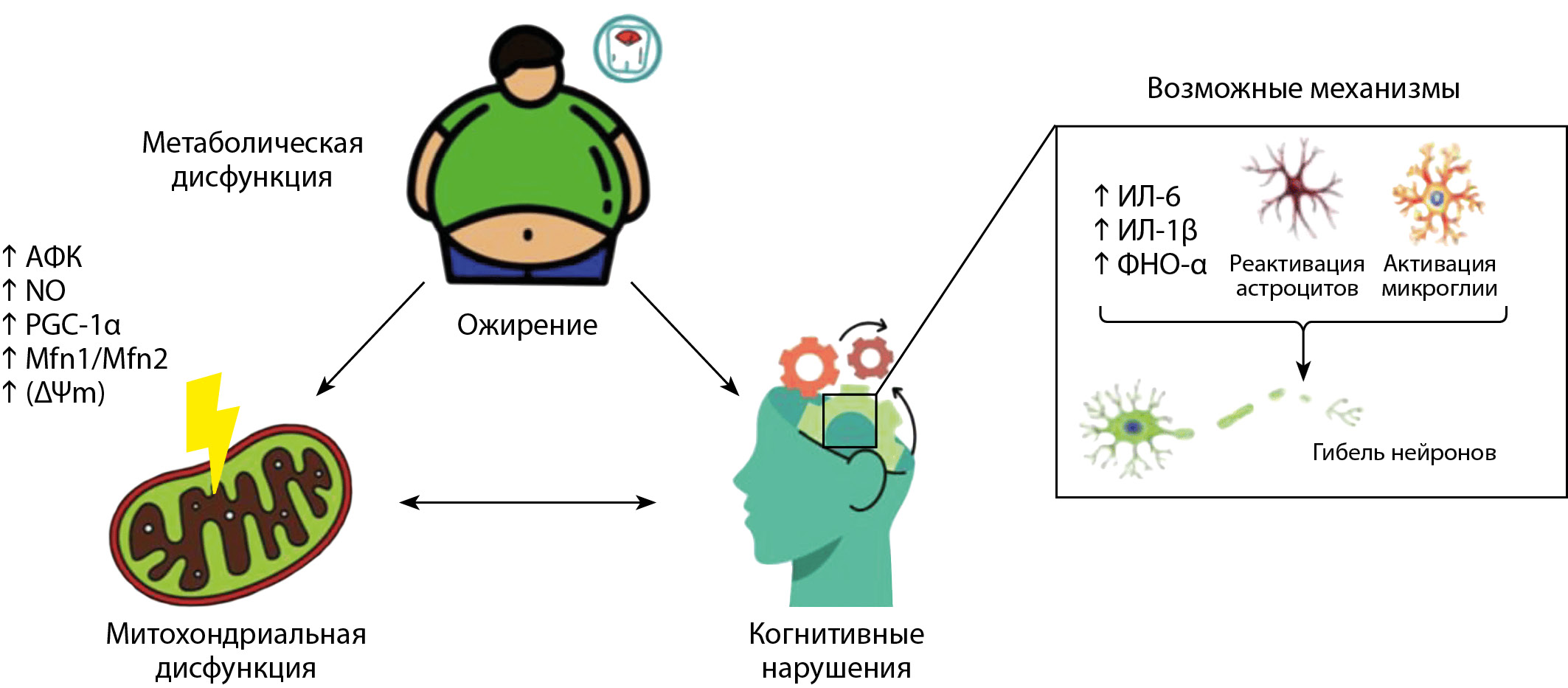 В обзоре Schmitt L.O., Gaspar J.M. [20] показано, что при ожирении наблюдается митохондриальная дисфункция, сопряженная с повышенным уровнем активных форм кислорода (АФК) и оксида азота (NO), снижением содержания белка — коактиватора 1-альфа-рецептора (PGC-1α), митофузинов 1 и 2 (Mfn1/Mfn2) и мембранного потенциала митохондрий (ΔΨm) (рис. 2). Все эти патологические изменения ассоциированы с развитием системного воспаления, сопровождающегося повышенной экспрессией ряда провоспалительных цитокинов, в частности интерлейкина-6 (ИЛ-6), интерлейкина-1 бета (ИЛ-1β) и некроза опухоли-α (ФНО-α) [20], и нарушением проницаемости гематоэнцефалического барьера (ГЭБ), что в свою очередь приводит к проникновению провоспалительных цитокинов в паренхиму головного мозга и дальнейшей активации глиальных клеток (микроглии и астроцитов) [21]. Активированная микроглия секретирует большое количество воспалительных цитокинов (TNFα, IL-1β и IL-6), поддерживая системное воспаление и приводя к еще большему повреждению нейронов [21].