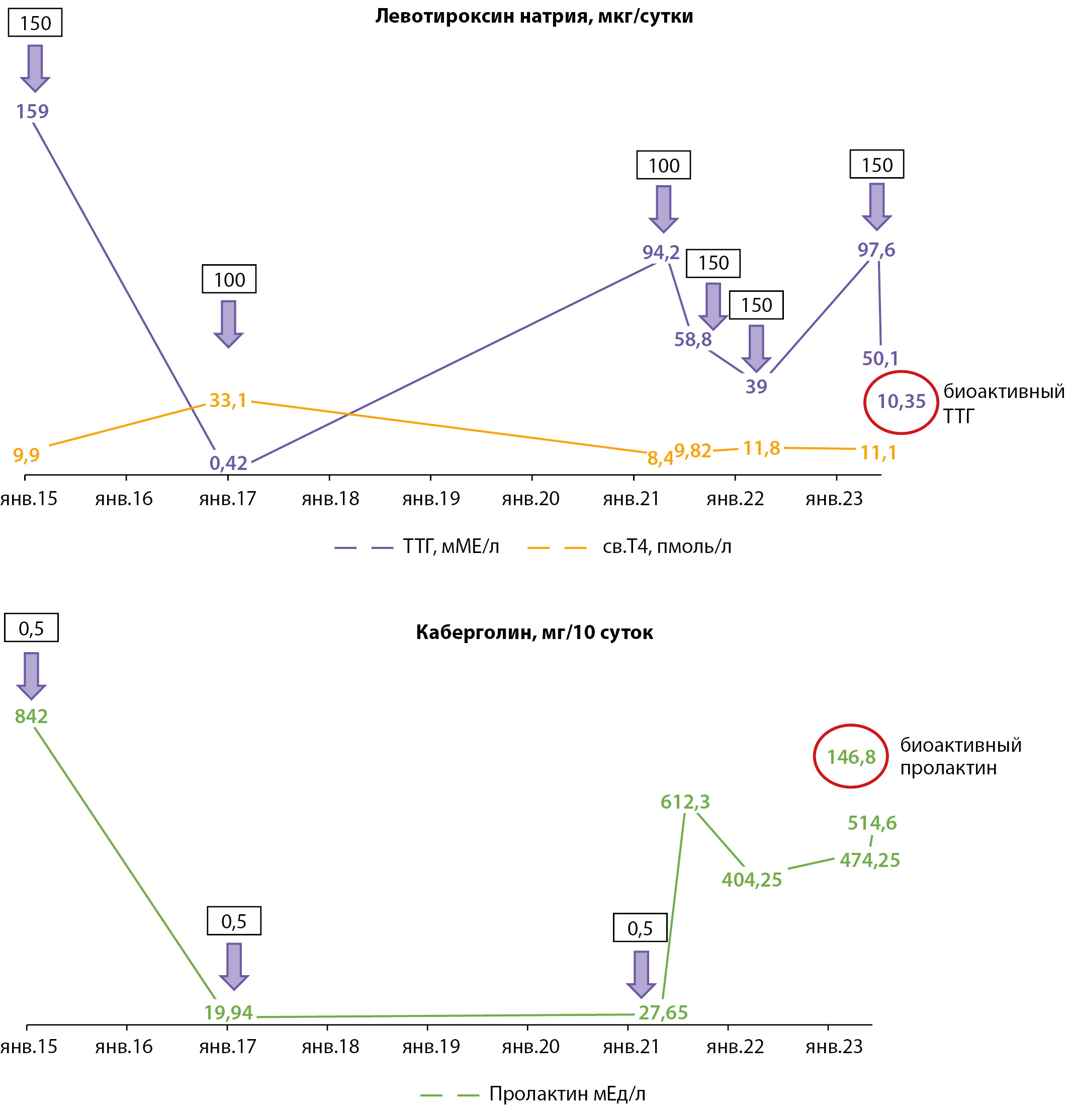 В 35 лет у пациента по результатам лабораторного исследования отмечена отрицательная динамика в виде увеличения уровня ТТГ до 97,6 мМЕ/л на фоне нормальных показателей свТ4 — 11,1 пмоль/л и свТ3 — 4,8 пмоль/л, и положительных АТ-ТПО 233,6 МЕ/мл. Правила приема препарата соблюдены. Отмечалось по-прежнему повышение общего пролактина до 474,25 мЕд/л, тестостерон — 14,05 нмоль/л, ЛГ 3 мМе/мл, ФСГ — 1,99 мМЕ/мл, эстрадиол — 36,49 пг/мл, ГСПГ 18,4 нмоль/л.