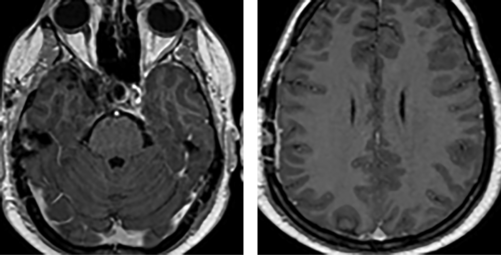 Рисунок 1. МРТ головного мозга пациента С. 35 лет визуализируются опухоли правой височной области и области задней поверхности пирамиды височной кости.