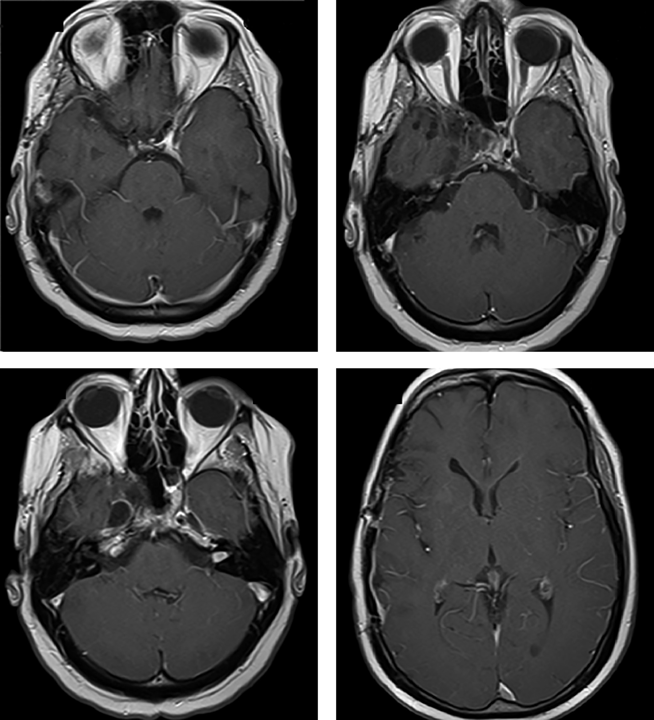 В 2015 г. в связи с появлением жалоб на головные боли было проведено МРТ-исследование головного мозга, выявившее объемные образования правой височной области и области задней поверхности пирамиды височной кости, убедительных данных за продолженный рост опухоли в области правого кавернозного синуса нет (рис. 1).