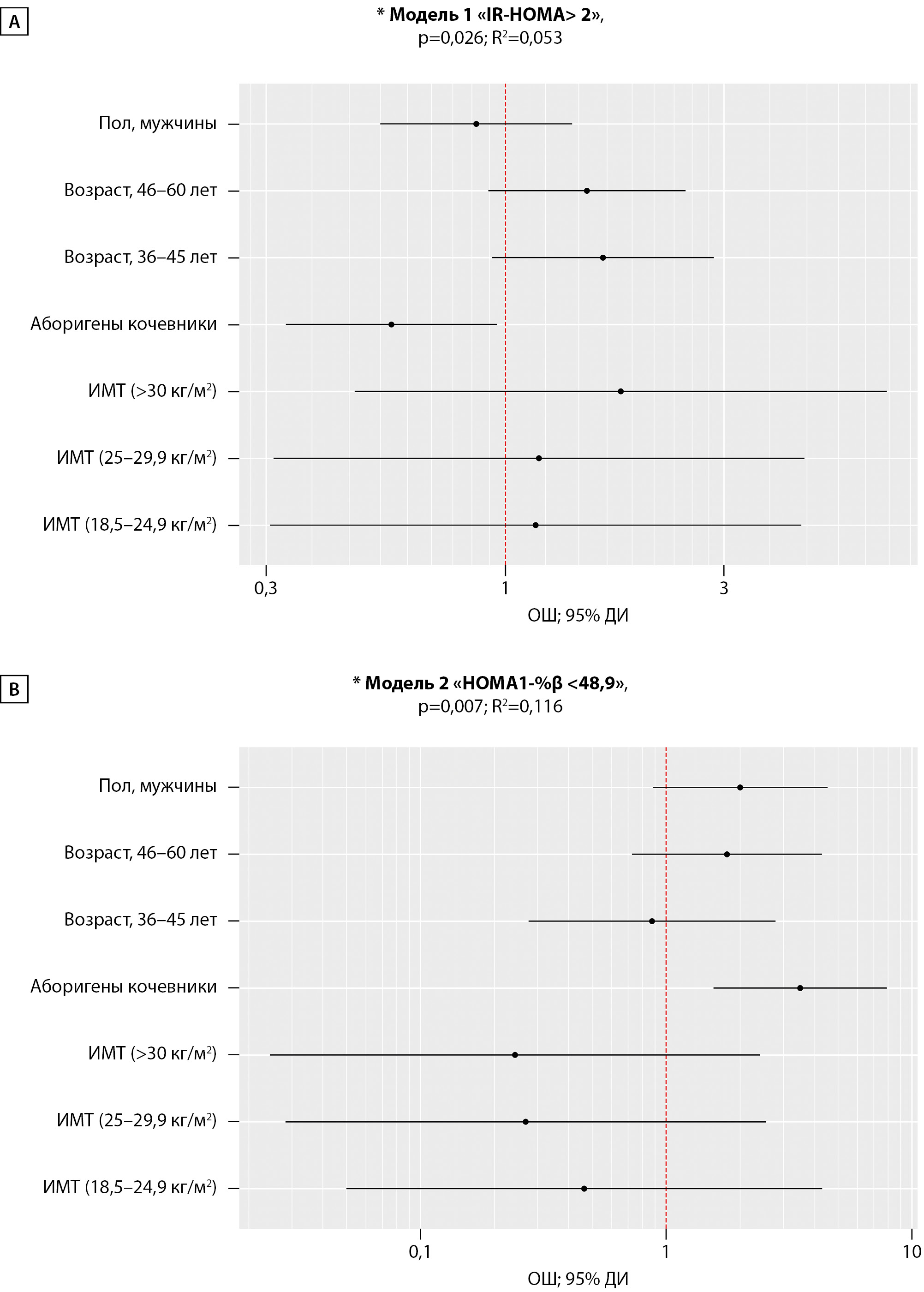 2. Figure 2. Estimation of the odds ratio for predictors (lifestyle, gender, age, BMI) of the indicator "IR-HOMA> 2" (A) and "HOMA1-%β <48.9" (B) in Arctic natives. | |