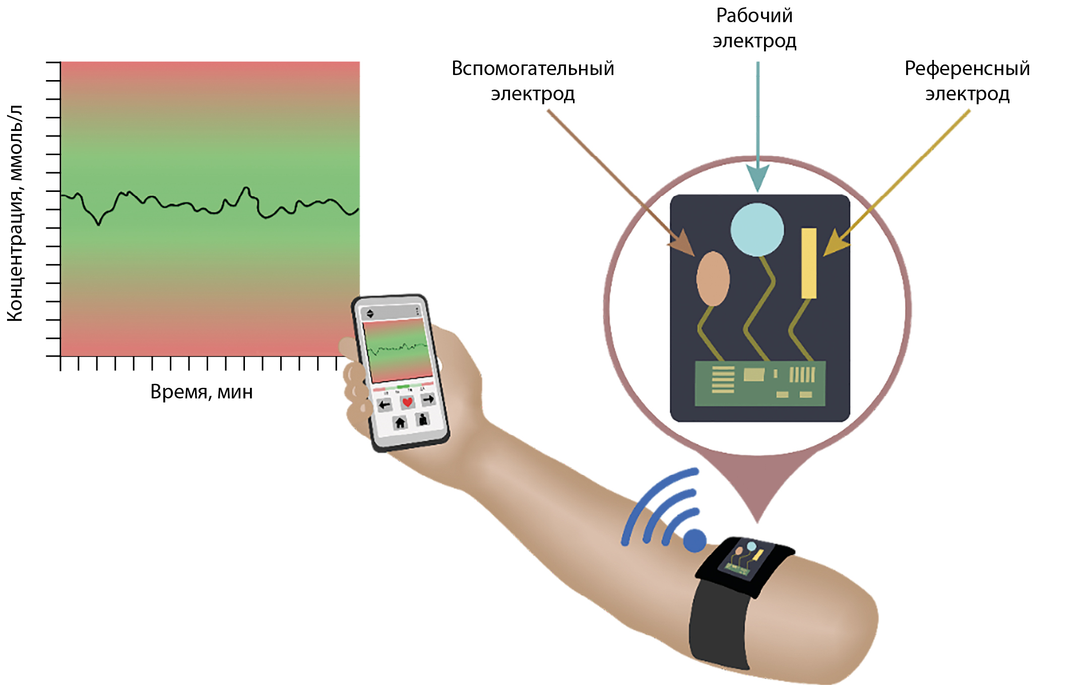 Развивающимся направлением современной диагностики являются модификации биосенсоров, предназначенные для ношения на поверхности тела (“wearable biosensors”) [47]. Такие датчики позволяют проводить неинвазивный мониторинг интересующего параметра в крови и иных биологических жидкостях. Многие модели устройств интегрированы с программным обеспечением смартфона, с которым связываются при помощи Bluetooth (рис. 1). В настоящее время биосенсоры для мониторинга уровня ионизированного кальция в клинической практике не применяются, но существуют в рамках экспериментальных работ. Так, Nyein et al. (2016 г.) создали биосенсор, определяющий в режиме реального времени концентрацию ионизированного кальция и значение рН в поте, планируются дальнейшие разработки для других биологических жидкостей [55]. Подобный неинвазивный метод оценки кальциемии был бы особенно актуален в педиатрической практике. Биосенсор на основе микроигл, сконструированный Molinero-Fernández et al. (2023 г.), позволяет мониторировать уровень ионизированного кальция непосредственно в крови, параллельно с определением pH и ионов K, Na, Li, Cl [56]. Но исследование данного прибора осуществлялось только в лабораторных условиях на животных.