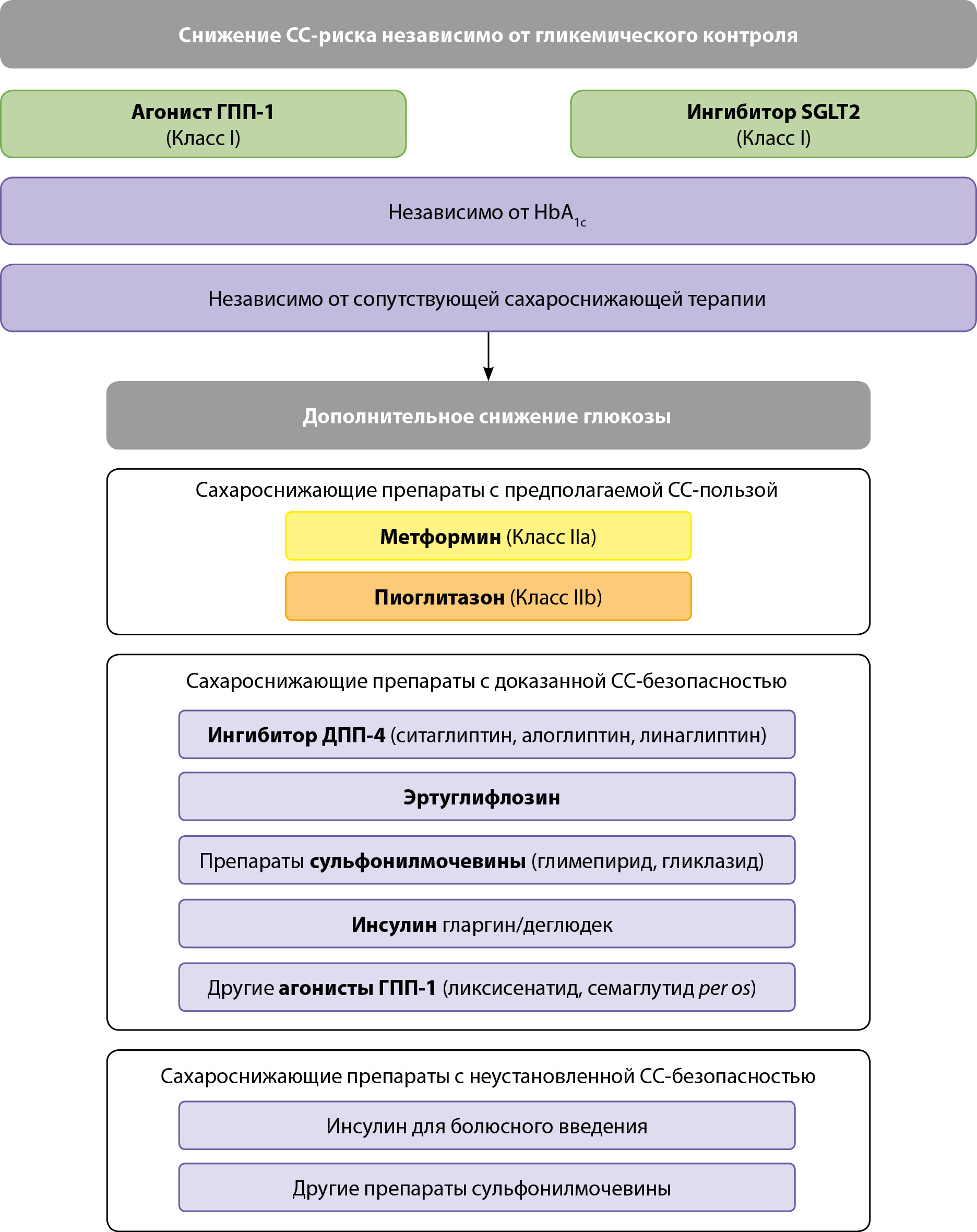Важным аспектом является также то, что у пациентов с СД2 и известным АССЗ лечение должно начаться с агониста ГПП-1 и/или ингибитора SGLT2 — препаратов с доказанной эффективностью снижения риска ССЗ — независимо от уровня HbA1c и сопутствующего приема сахароснижающих препаратов (класс I) (рис. 3).