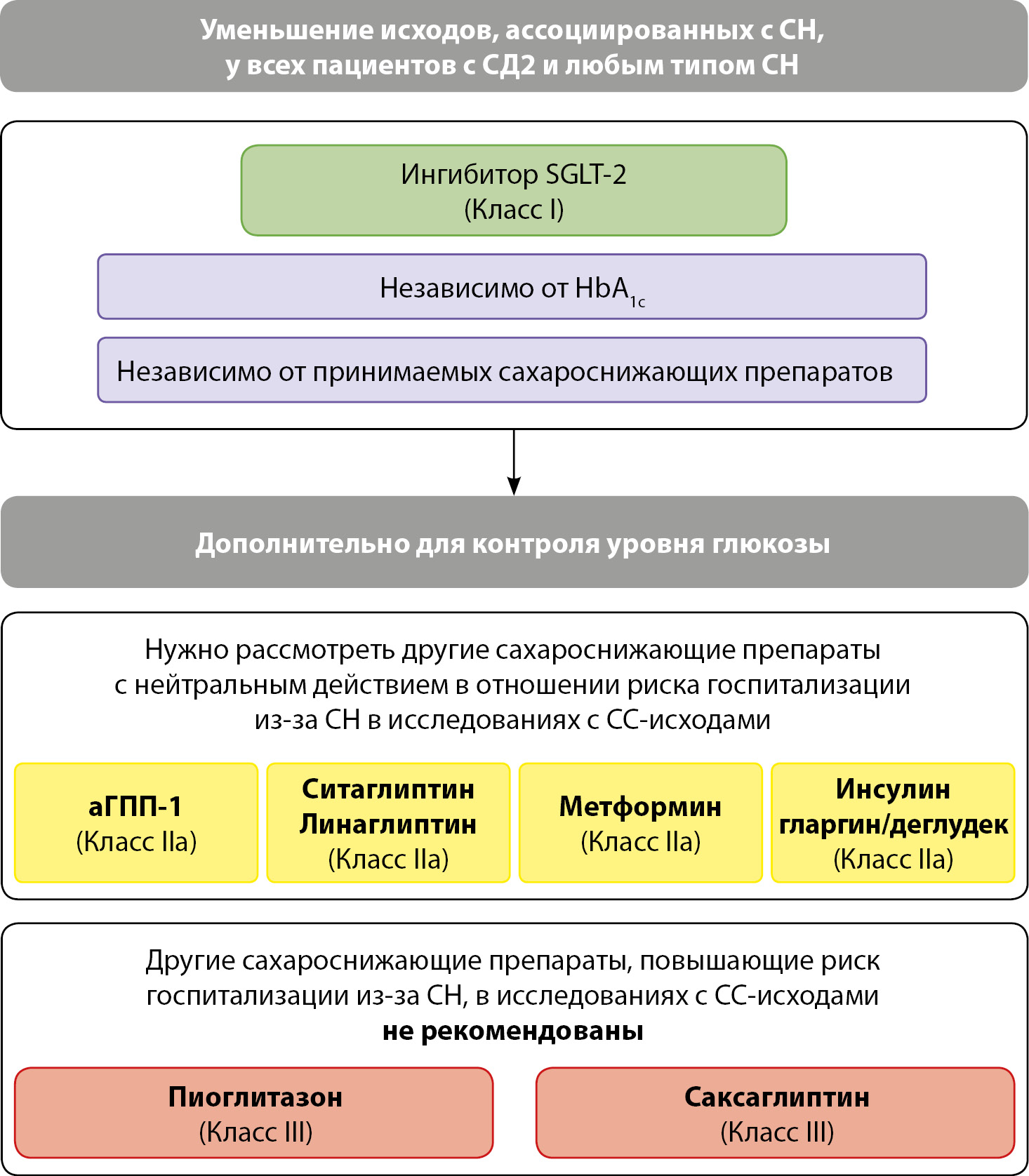 На рис. 4 схематично представлены общие принципы применения сахароснижающей терапии у пациентов с СН и СД2.