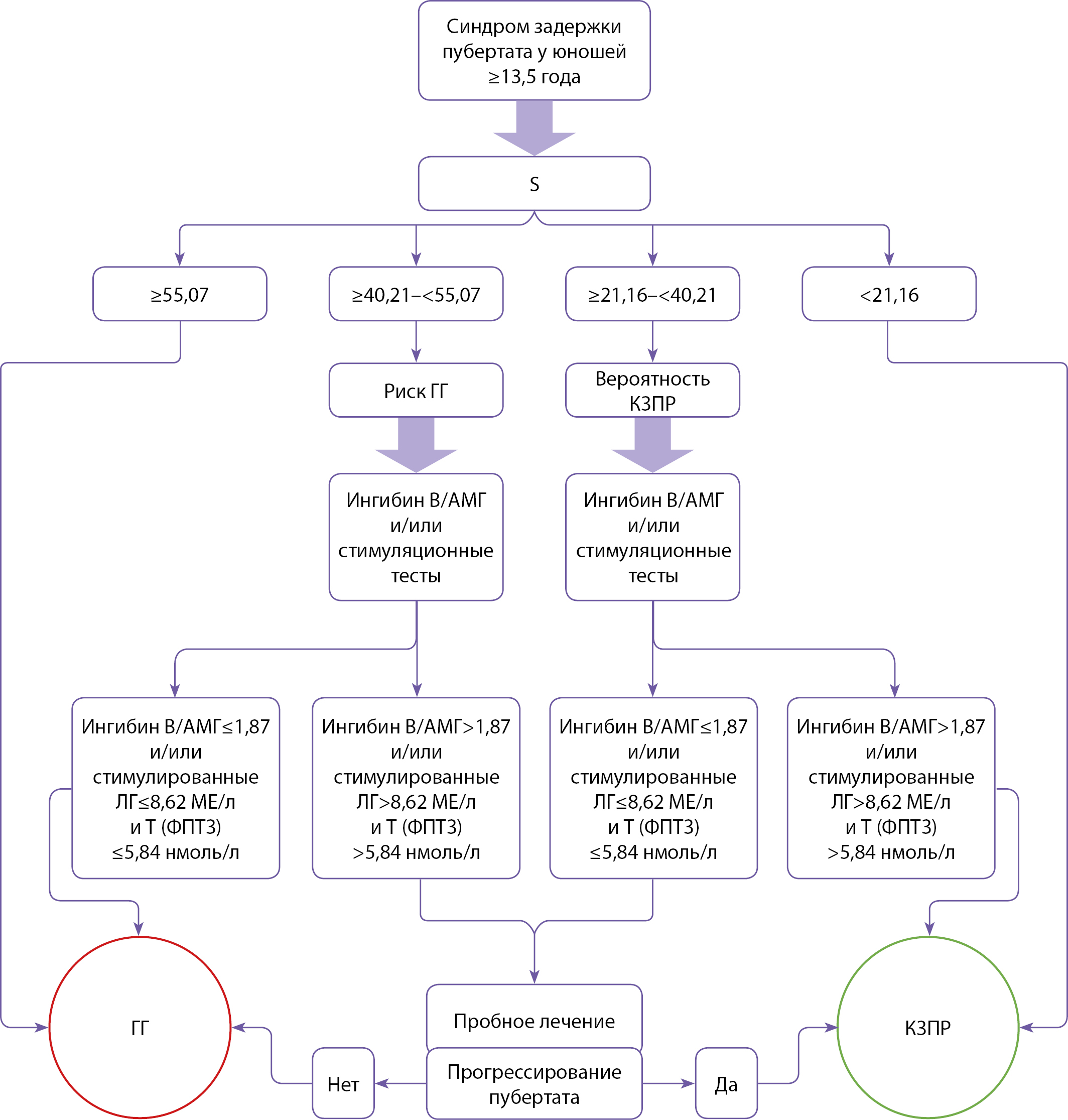 РЕЗУЛЬТАТЫ. В исследование включили юношей 13,5–17 лет с синдромом задержки пубертата: 56 — с целью создания метода дифференциальной диагностики, 30 — его контроля (группа контроля). Разработали количественный способ, позволяющий дифференцировать ГГ и КЗПР. На основании проведенного ROC-анализа установили наиболее чувствительные и специфичные маркеры ГГ и выбрали из них доступные для амбулаторного исследования базальные уровни ЛГ, ФСГ, Т, ингибина В. Для каждого показателя, основываясь на результатах собственного исследования и данных литературы, подобрали интервалы значений, в зависимости от них — оценки ЛГ, ФСГ, Т и ингибина В, а также коэффициенты (k) для каждого показателя. Баллы вычисляли путем умножения оценки на k, после чего суммировали и нормализовали к максимальной сумме, которую мог получить пациент. Для повышения точности диагностики ввели возрастной коэффициент. Итогом вычисления стал результат балльной оценки (S). S при КЗПР (10,65 [3,13–14,91]) статистически значимо отличался от такового при ГГ (76,46 [57,79–83,74]) (p< 0,001). Поставленные на основании S (<21,16 и ≥55,07) диагнозы в группе контроля подтверждены данными катамнеза в 97% случаев. Разработан алгоритм дифференциальной диагностики ГГ и КЗПР с использованием S.