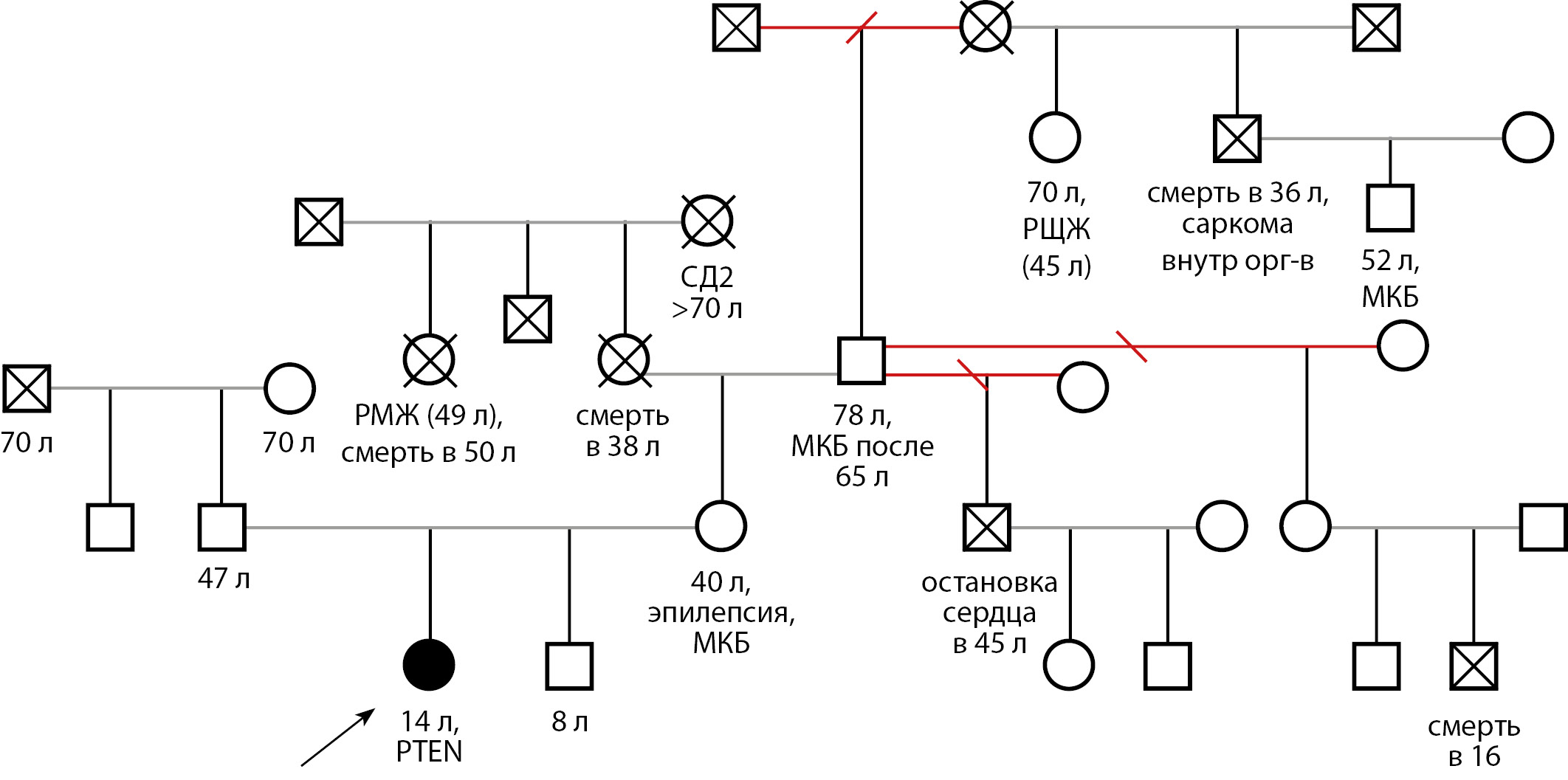 В ноябре 2019 г. в ФГБУ «НМИЦ эндокринологии» впервые была госпитализирована девочка в возрасте 10 лет 7 мес. с жалобами на наличие узловых образований в обеих долях ЩЖ. Наследственный анамнез отягощен по онкологическим заболеваниям со стороны матери: двоюродный дедушка — саркома внутренних органов, смерть в 36 лет; двоюродная бабушка — рак молочной железы, смерть в 50 лет; у другой двоюродной бабушки (на момент написания статьи — 70 лет, жива) в анамнезе — тиреоидэктомия по поводу РЩЖ, родной дядя умер в возрасте 45 лет, причина внезапной смерти не установлена (рис. 1).