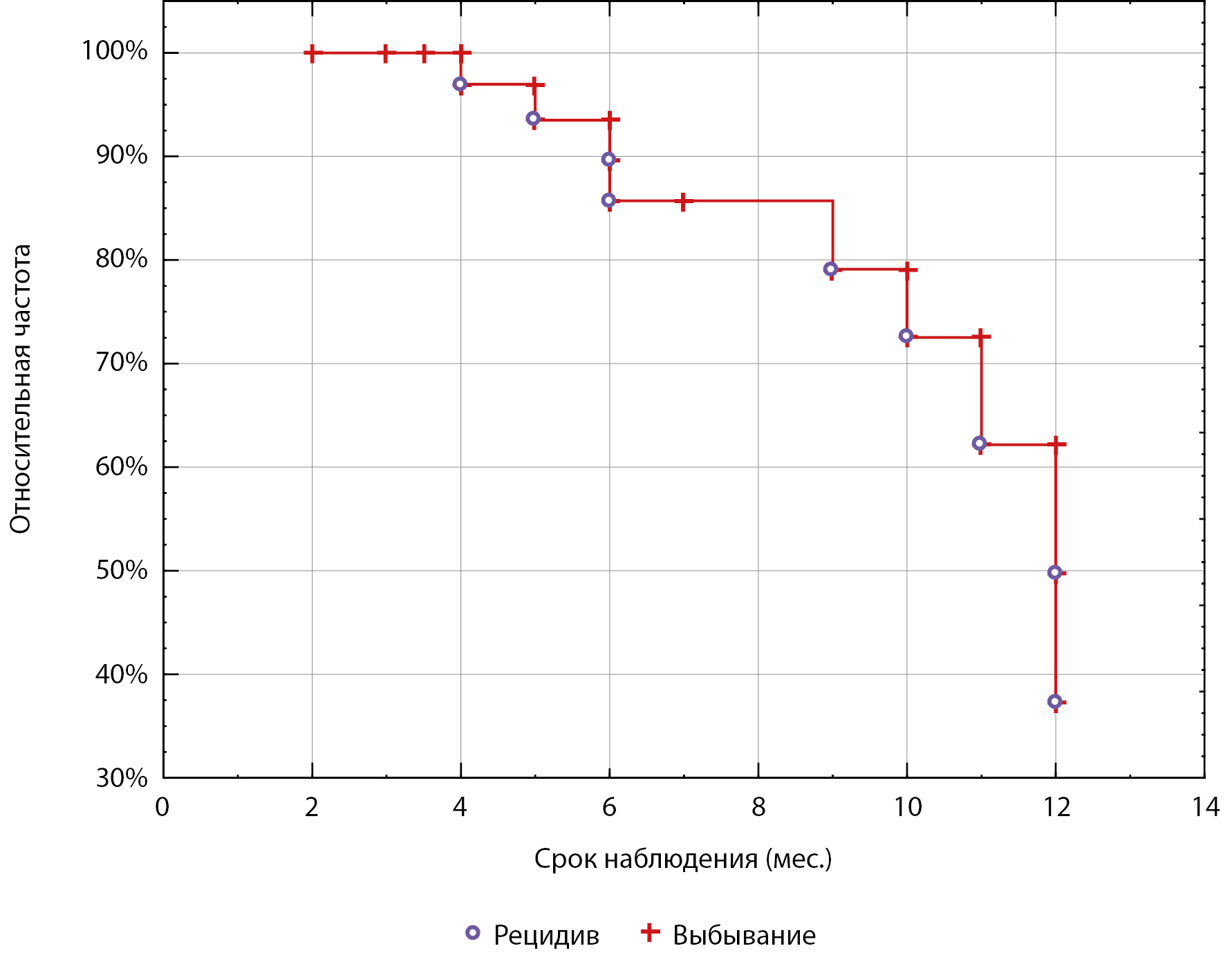 1. Рисунок 1. Сроки возникновения рецидива в изучаемой группе 41 пациента (кривая Каплана-Майера)