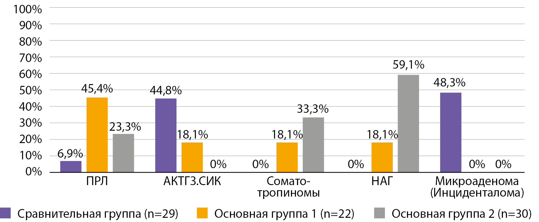 Критерии включения (основная группа): гормонально активные и гормонально неактивные аденомы с эндо-, инфра-, супраселлярным и тотальным ростом, микроаденомы (размером менее 1 см) и макроаденомы (размером более 1 см) и гигантские аденомы (размером более 4 см), имеющие агрессивное течение (рецидивирующее, резистентность, быстрый рост и визуализационных характеристик агрессивного роста).