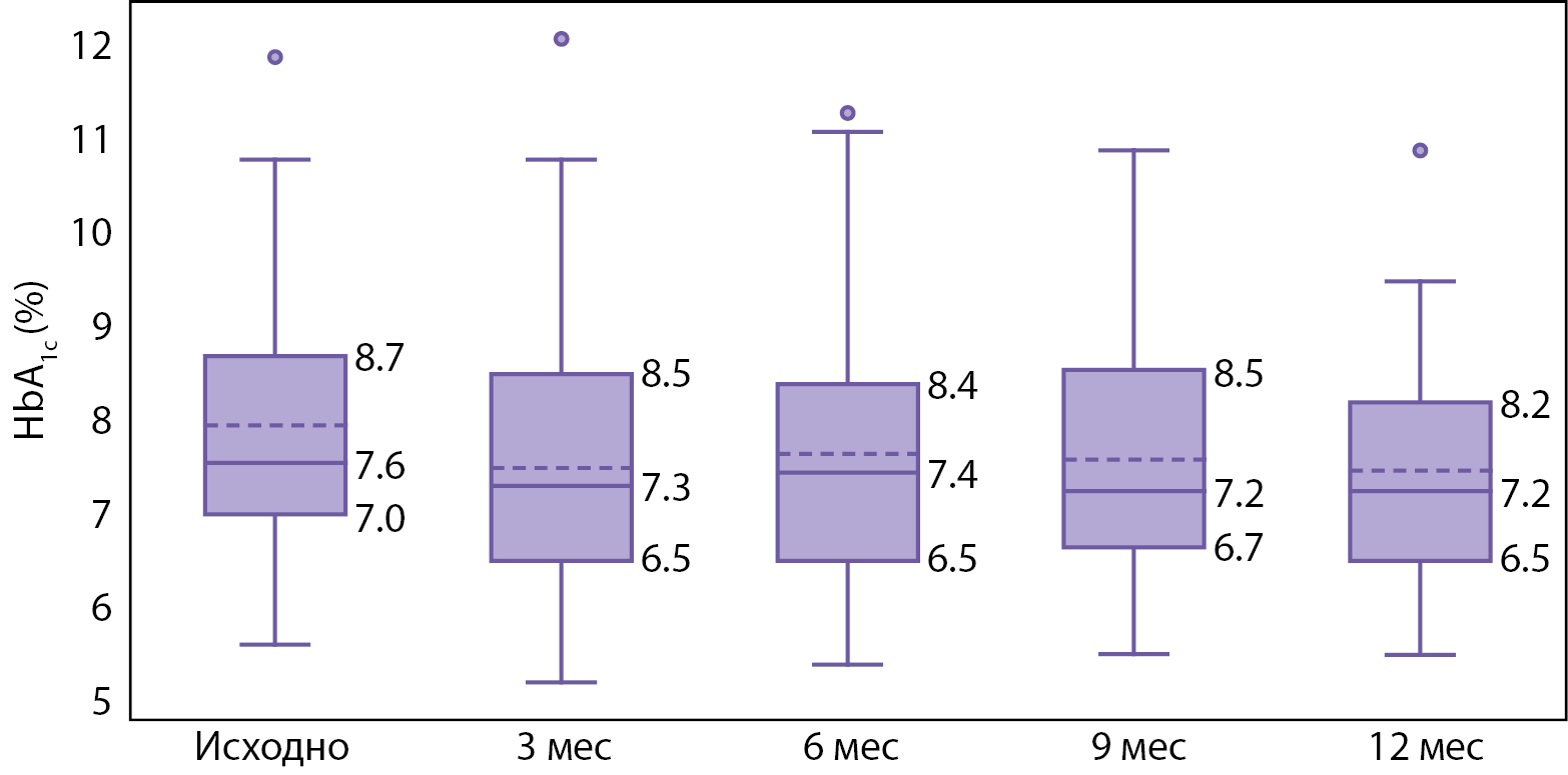 1. Рисунок 1. Показатели гликированного гемоглобина (НbА1с) в течение исследования.