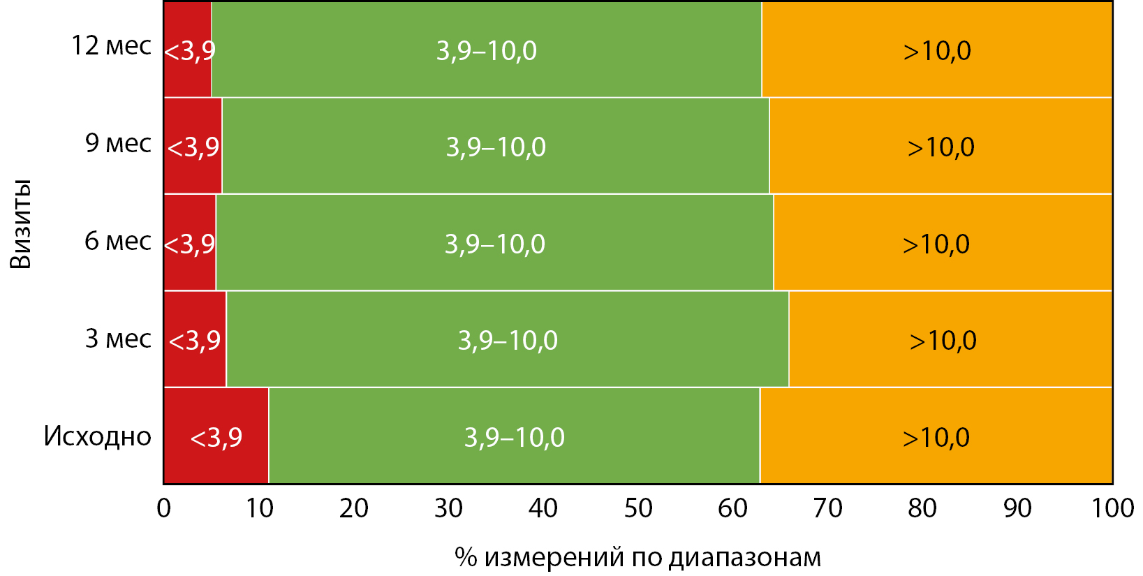 Параллельно со снижением уровня гликированного гемоглобина отмечалось увеличение % измерений в целевом диапазоне от 3,9 до 10,0 ммоль/л, что в основном достигалось за счет снижения % измерений выше целевого диапазона более 10,0 ммоль/л (рис. 2).