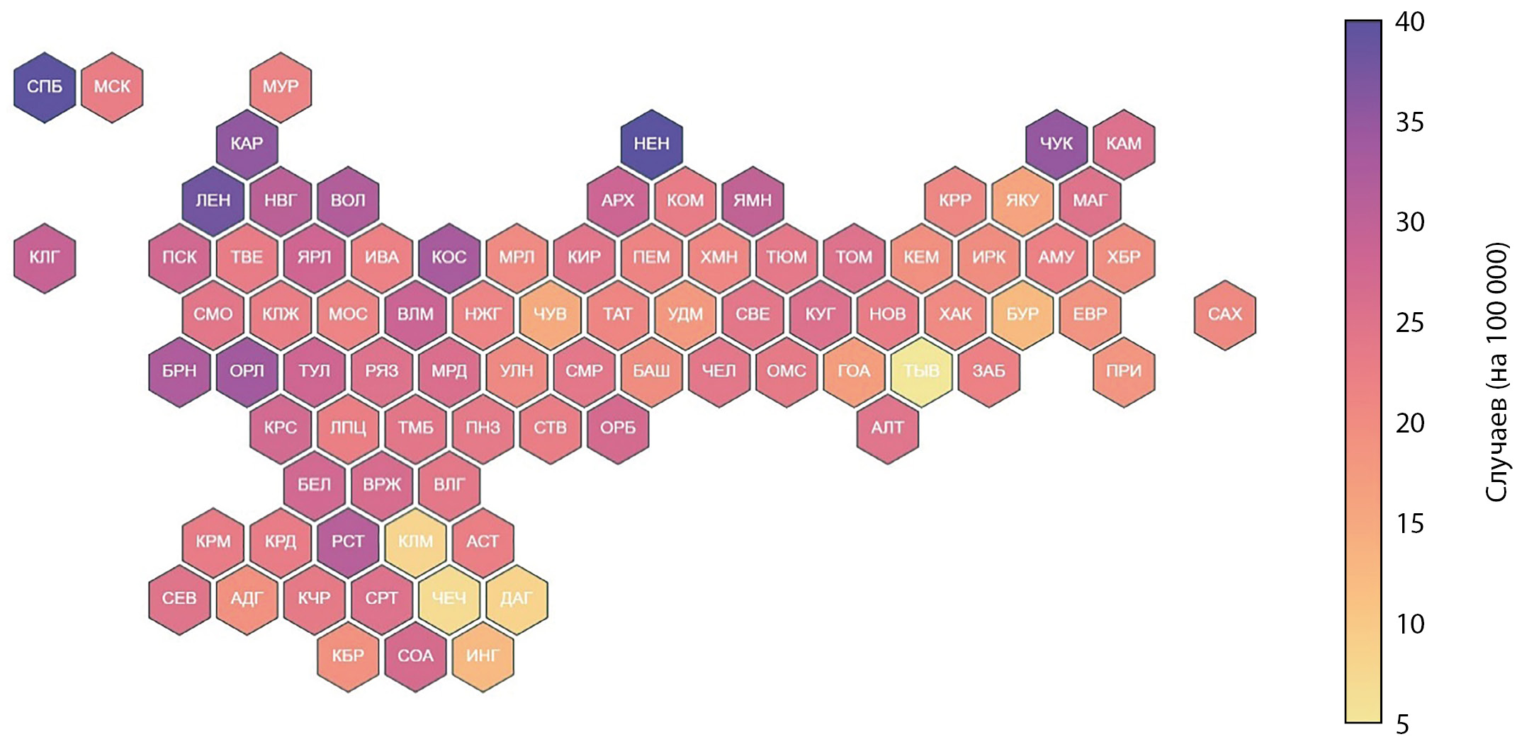 Заболеваемость СД1 значительно различалась между субъектами Российской Федерации (рис. 3). Наибольшая заболеваемость за анализируемый период отмечалась в Ненецком автономном округе, Санкт-Петербурге и Ленинградской области — 63,4, 39,8 и 38 на 100 000 детского населения соответственно. Наименьшая заболеваемость зафиксирована в Республике Тыва, Чеченской Республике и Республике Калмыкия — 5, 7,1 и 8,1 на 100 000 детского населения соответственно. В целом можно отметить тенденцию к большей заболеваемости СД1 в северных и северо-западных регионах страны, и к меньшей заболеваемости СД1 в Северо-Кавказском регионе.