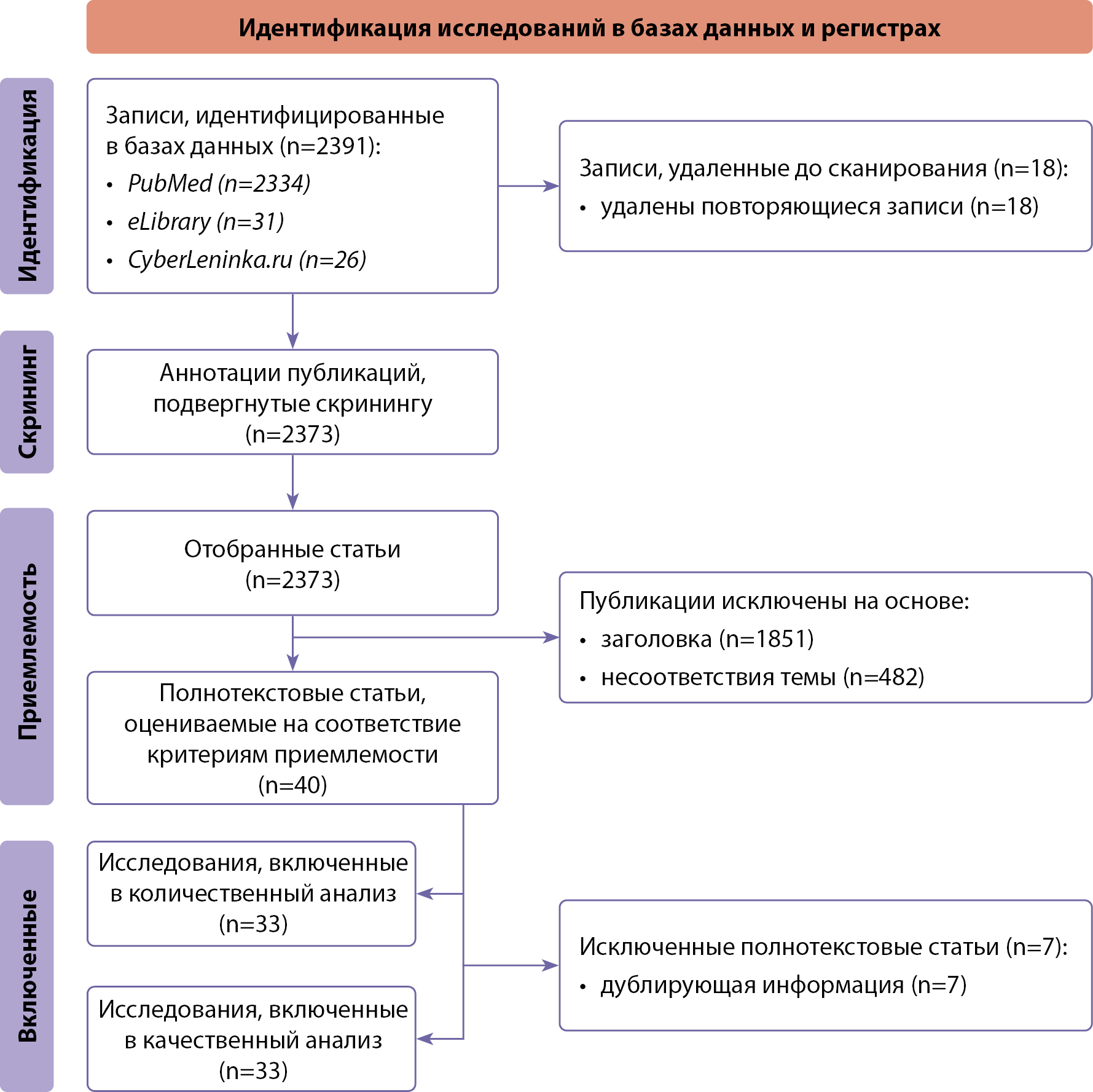 Проводился поиск работ, опубликованных в период с января 2018-го по январь 2024 гг., соответствующих критериям включения. Схема поиска представлена на рисунке 1. В ходе поиска, после удаления дублирующих публикаций, выявили 2373 релевантных исследования, из них отобрано 33 полнотекстовых статьи, которые отвечали критериям приемлемости для данной работы.