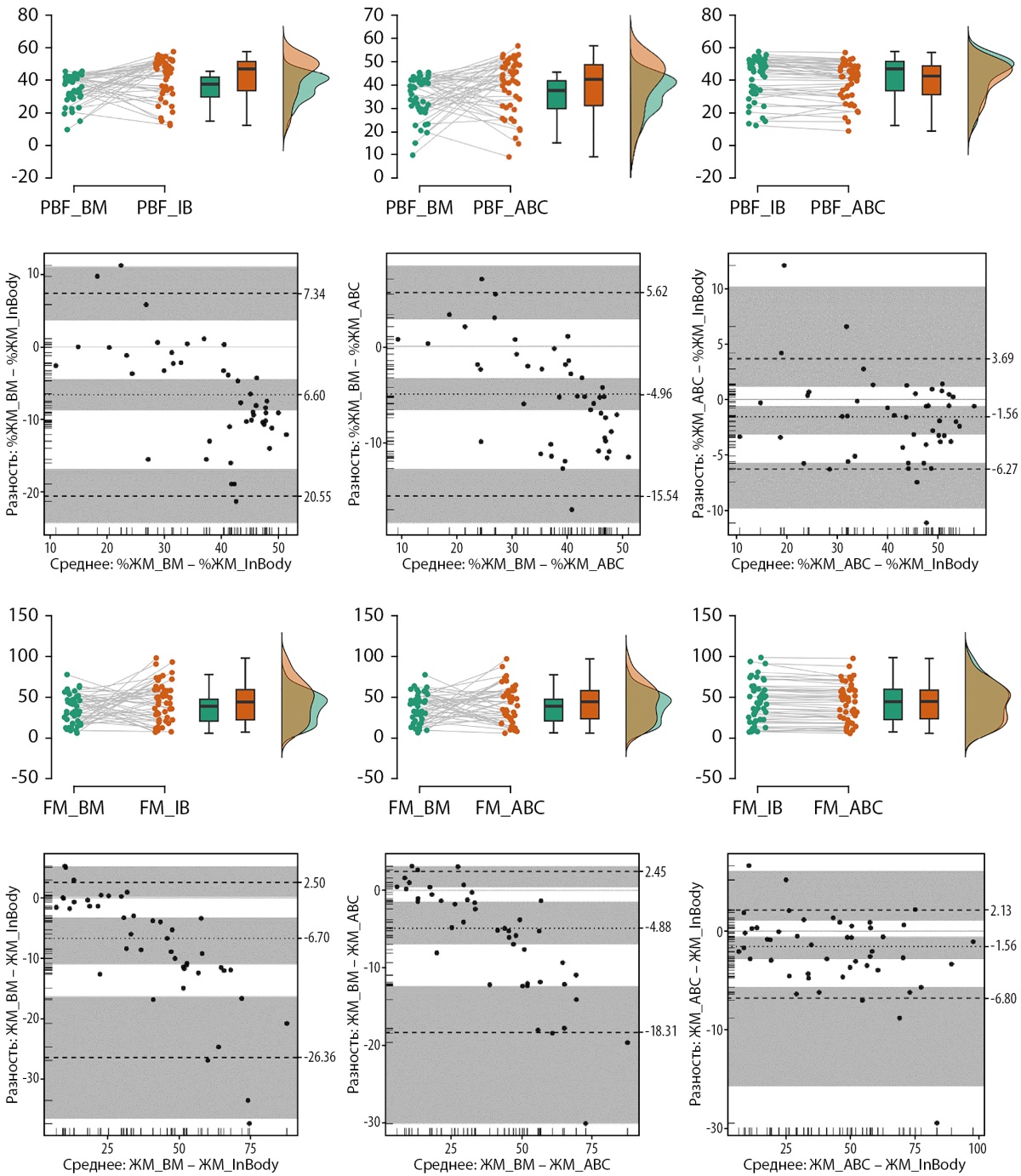 3. Рисунок 3. Графики Гарднера-Олтмена и Блэнда-Олтмена для значений жировой массы тела (FM), и ее доли (PBF), определенных в ходе УЗ-сканирования (BM), и различных биоимпедансных анализаторов (InBody770 и АВС-02).