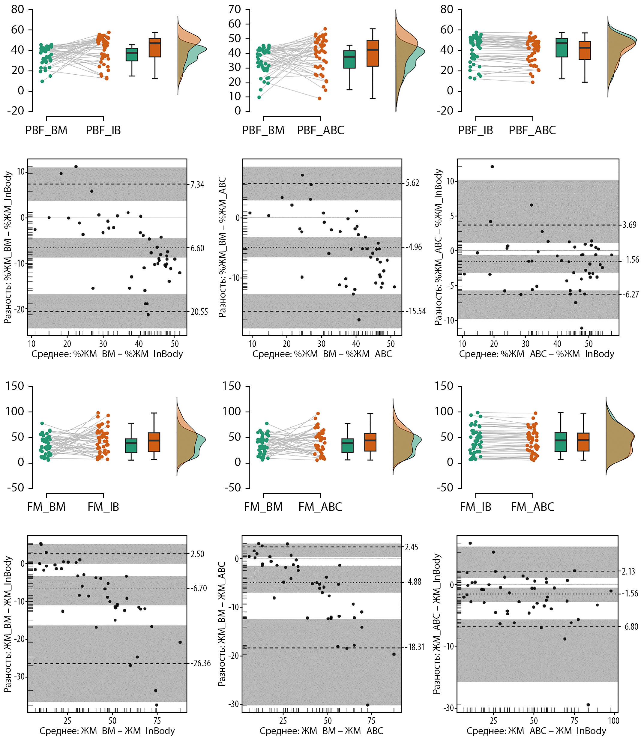 В статистике нет единого универсального метода проверки согласованности лабораторных методов. Поэтому согласно современным рекомендациям, для решения основной задачи настоящего исследования — оценить согласованность трех косвенных методов определения состава тела — в работе использовали комплексный подход [12][13] с вычислением информационно взаимодополняющих статистических показателей: средняя разность (MD); стандартизированная средняя разность (размер эффекта по Коэну для парных наблюдений с учетом их корреляции, dRM) [14]; коэффициенты корреляции Пирсона (r) и Спирмена (rS); коэффициент конкордатной корреляции Лина (CCC), который измеряет согласие между двумя измерениями одной и той же переменной, и его рекомендуют для оценки воспроизводимости при повторении экспериментов, согласия между результатами разных методов и т.п., анализ Блэнда-Олтмена.