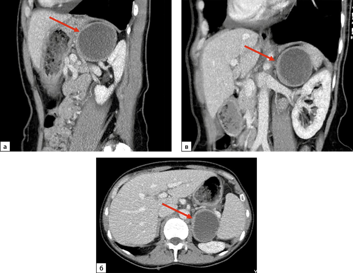 а — сагиттальная плоскость, б — аксиальная плоскость, в — фронтальная плоскость. Стрелками обозначена феохромоцитома левого надпочечника, хорошо визуализируется симптом «кольцевого ободка».