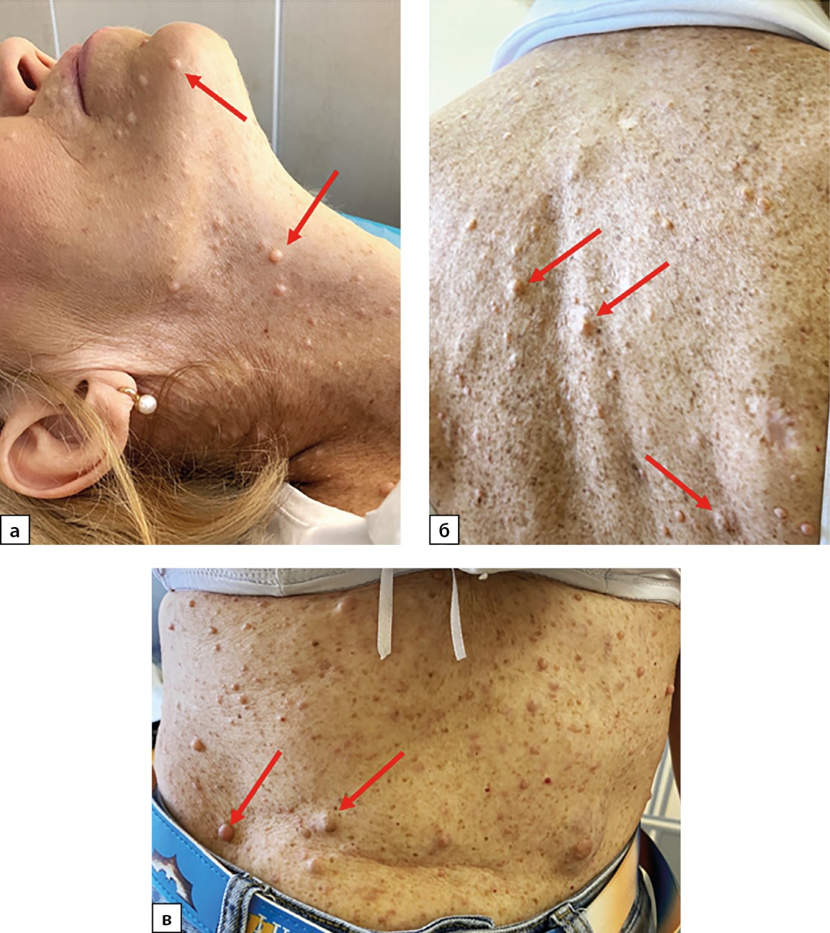 а — нейрофибромы кожи лица и шеи, б — нейрофибромы и «веснушчатая», гиперпигментация кожи спины, в — нейрофибромы и «веснушчатая» гиперпигментация кожи живота. Стрелками обозначены нейрофибромы кожи.