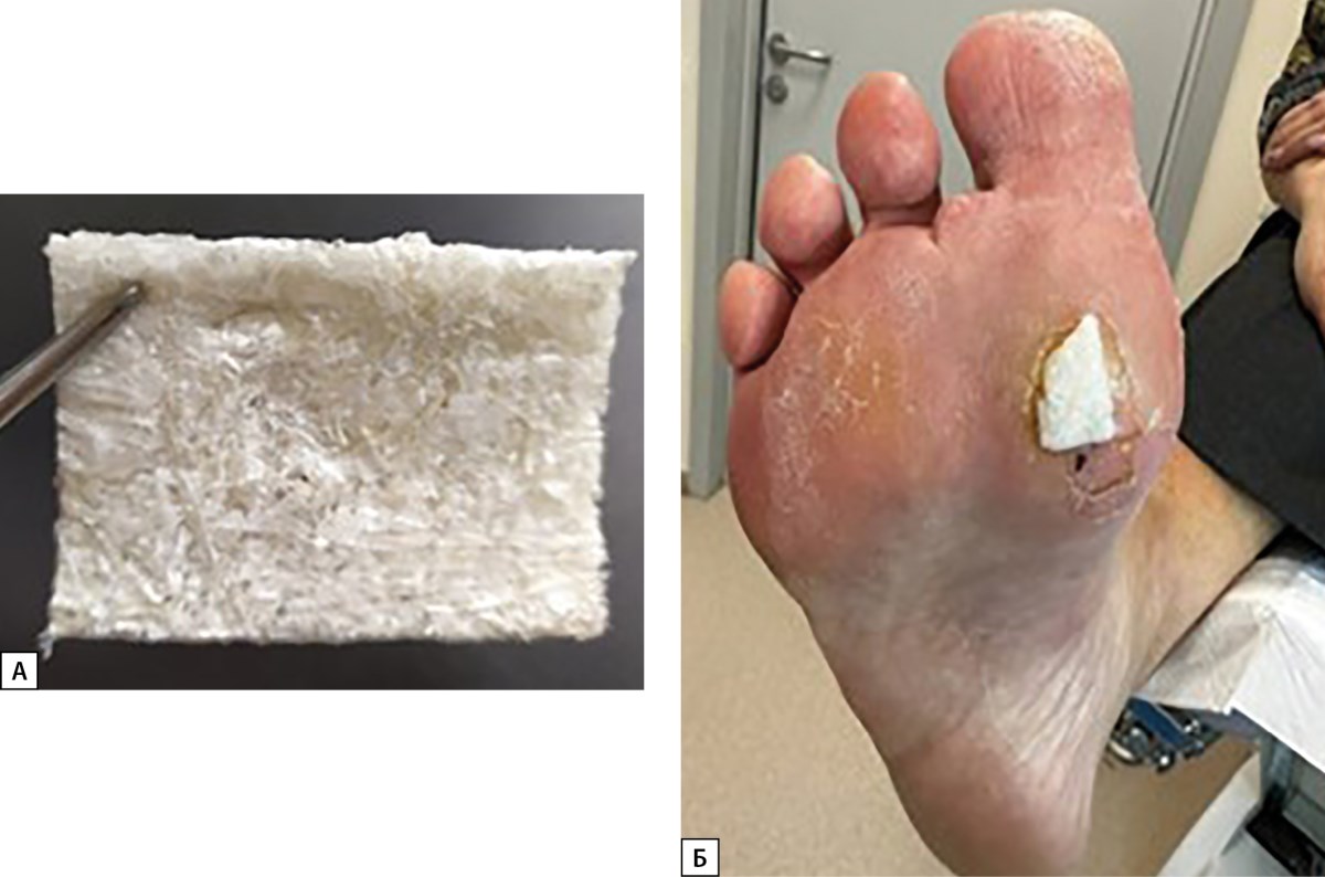 Рисунок 9. А — бесклеточная матрица из пуповины человека, Б — перевязка раны с использованием бесклеточной матрицы из пуповины человека.