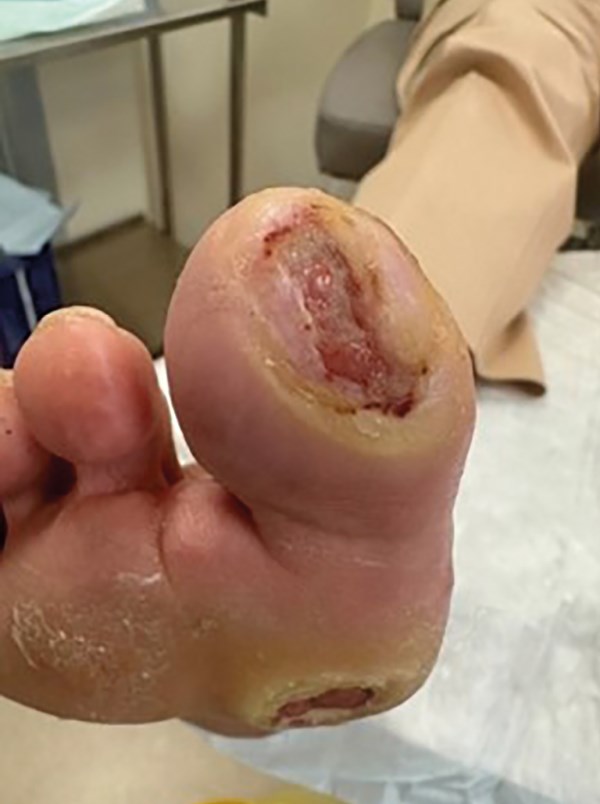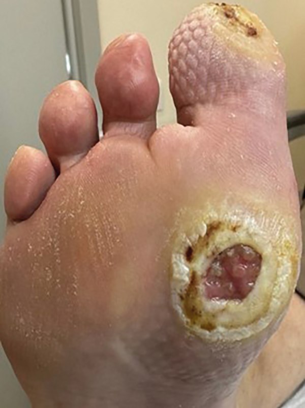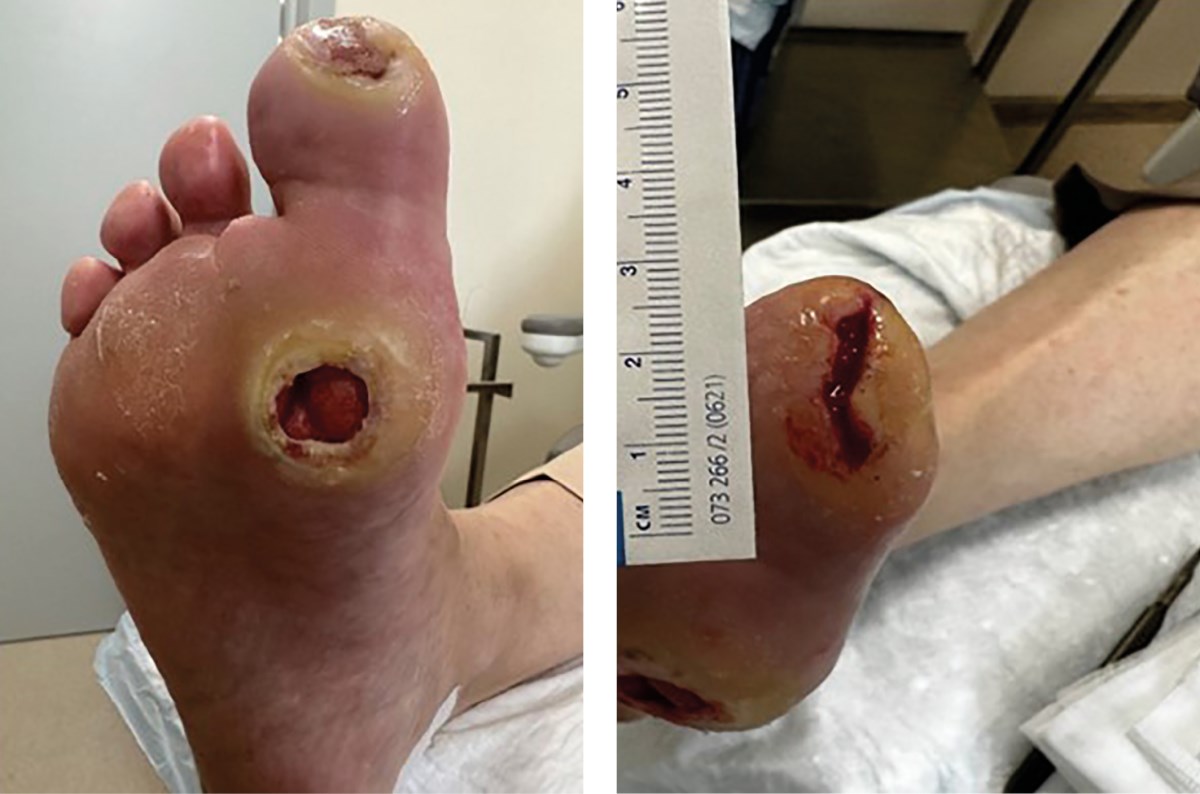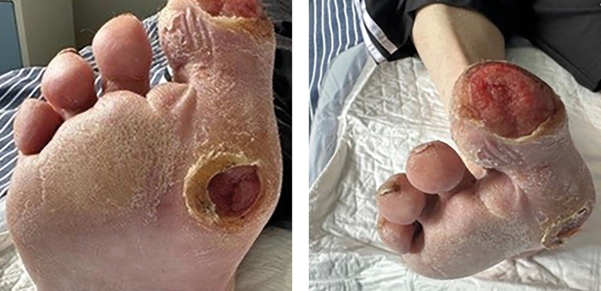 Во время первой госпитализации в клинику при осмотре правой стопы (июль 2023 г.): отсутствует второй палец, ампутированный в 2019 г. из-за осложнений СДС. На подошвенной поверхности стопы отмечается гиперкератоз. Визуализируются дефекты мягких тканей в области подошвенной поверхности первого пальца и первого плюснефалангового сустава правой стопы. Дефект округлой формы, диаметром около 1,5–2 см, с неровными краями и признаками гиперкератоза вокруг. Дно дефекта покрыто грануляциями, умеренно влажное, с серозным отделяемым, без признаков нагноения (рис. 1). Покровы стопы умеренно гиперемированы, кожа сухая, с признаками снижения тургора. Пальпация первого плюснефалангового сустава безболезненная, в области головок плюсневых костей имеются плотные мозоли.