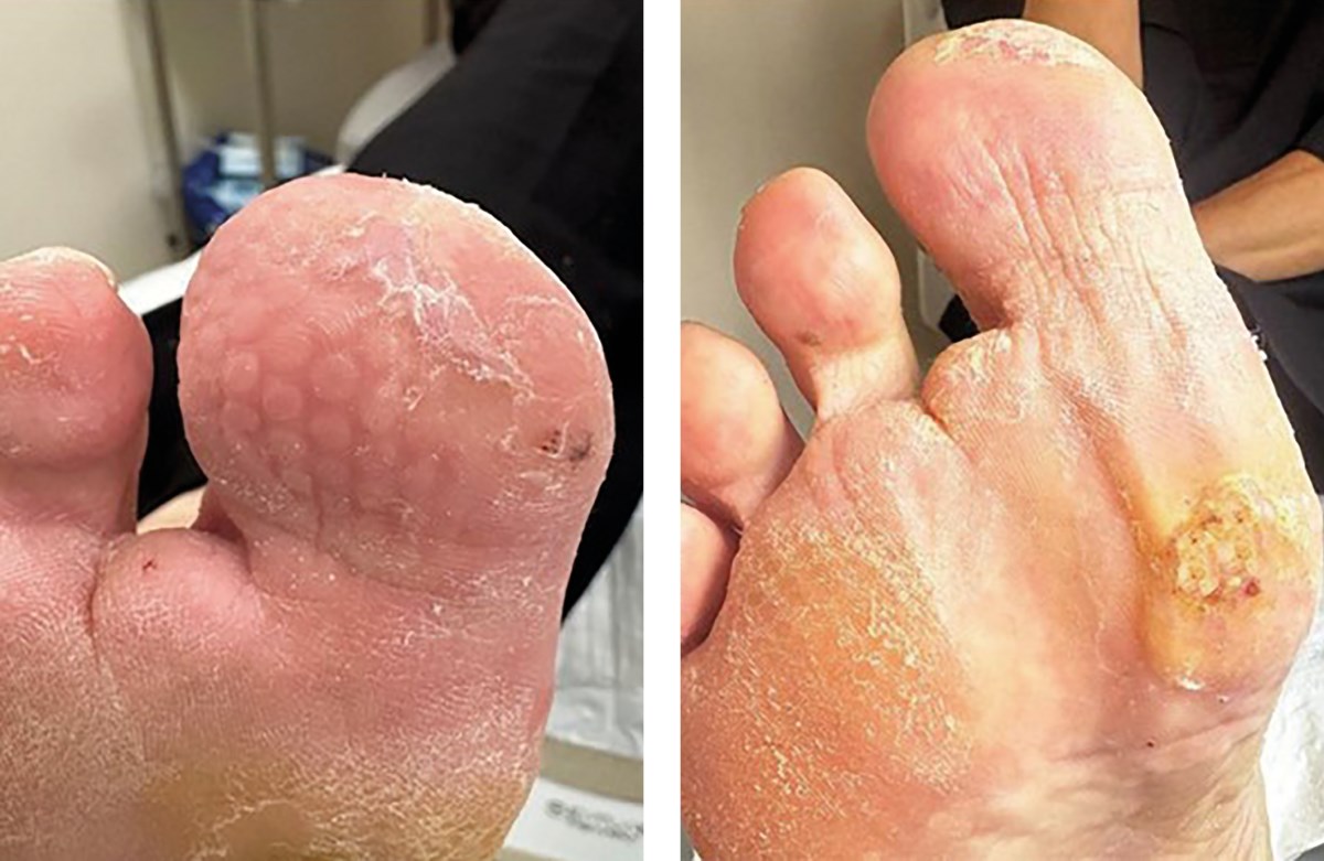 Рисунок 10. Динамика заживления ран после использования бесклеточной матрицы из пуповины человека (конец августа 2024 г.): диабетическая рана большого пальца полностью покрыта эпителием, раневая область первого плюснефалангового сустава эпителизирована, гиперкератоз менее выражен.