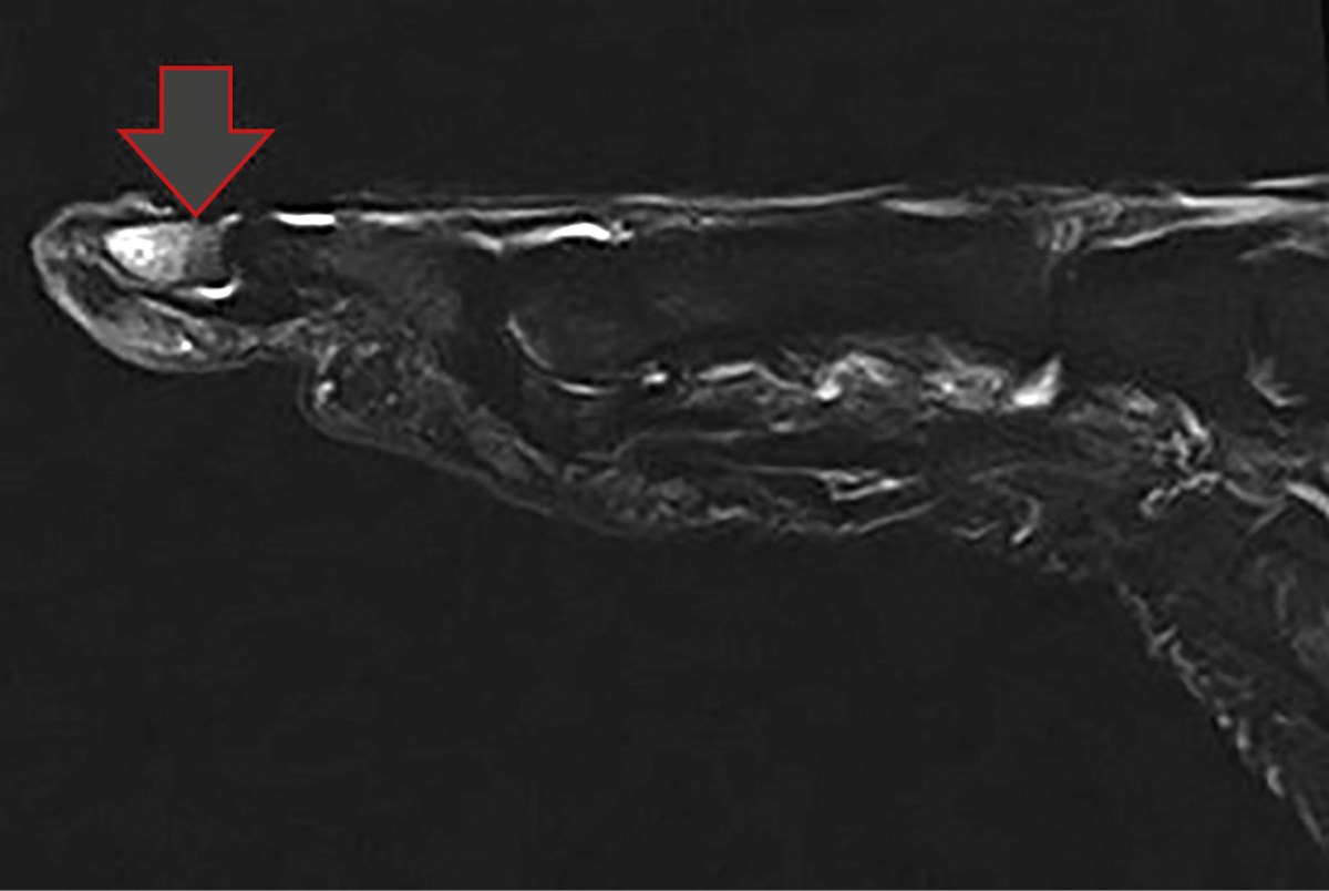 3. Рисунок 3. Магнитно-резонансная томография правой стопы. Трабекулярный отек костного мозга дистальной фаланги первого пальца.