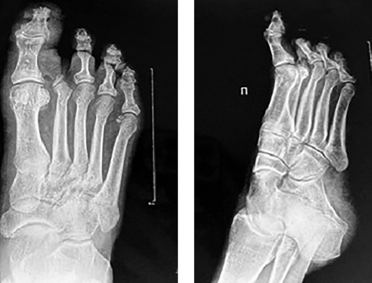 Рисунок 2. Рентгенограмма правой стопы в двух проекциях. Уменьшена ширина суставных щелей первого плюснефалангового сустава и межфалангового сустава первого пальца, наблюдается субхондральный склероз и заострение суставных поверхностей.