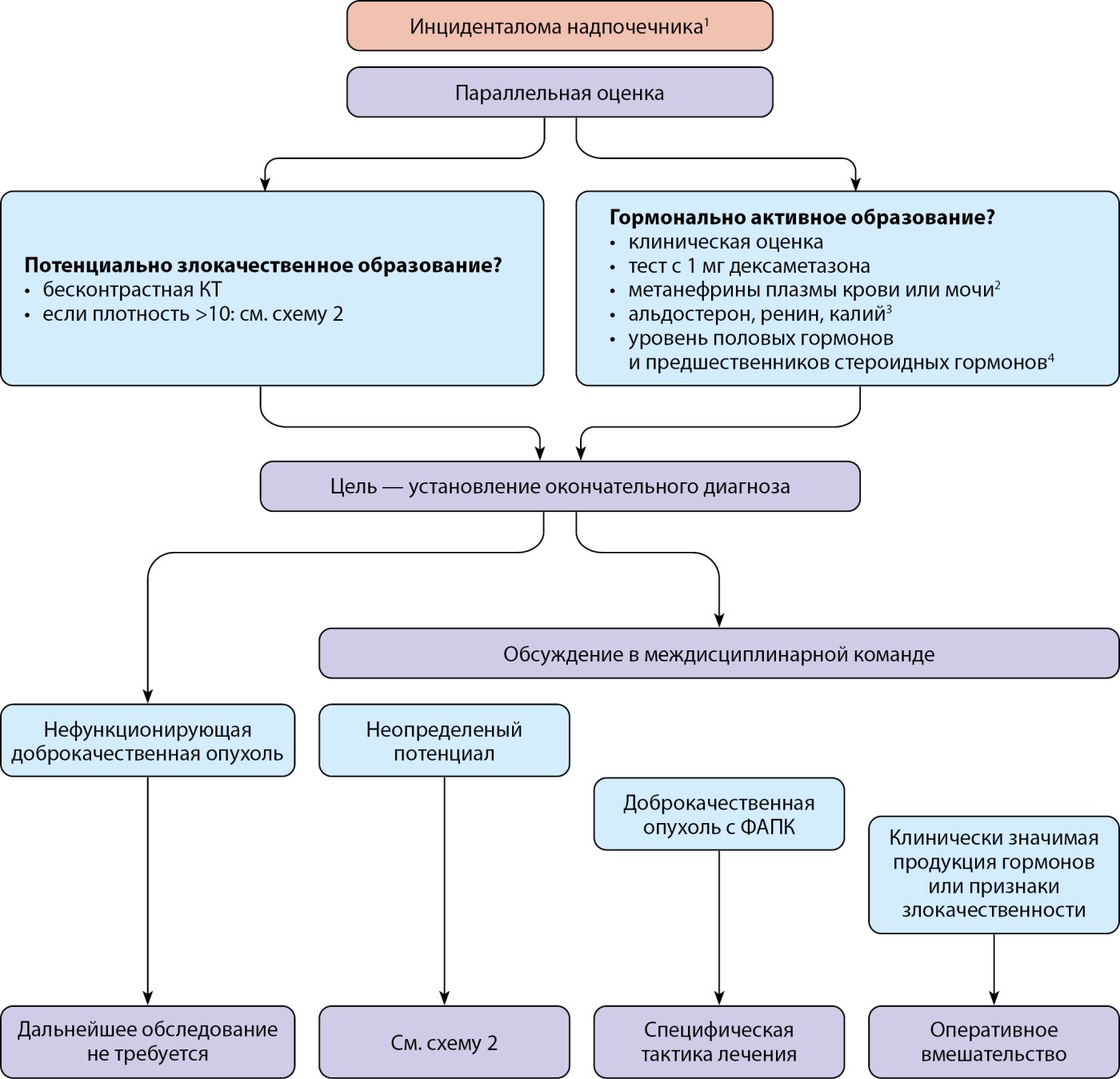*1) у небольшой подгруппы пациентов (образования надпочечников >4 см со злокачественными признаками, возраст <40 лет, беременность, выраженный избыток гормонов надпочечников) требуется срочная оценка; 2) необходимо только при опухолях надпочечников с плотностью >10 ед.Н; 3) только у пациентов с сопутствующей гипертонией и/или гипогликемией; 4) только у пациентов с клиническими, биохимическими или визуальными признаками, указывающими на адренокортикальный рак.
