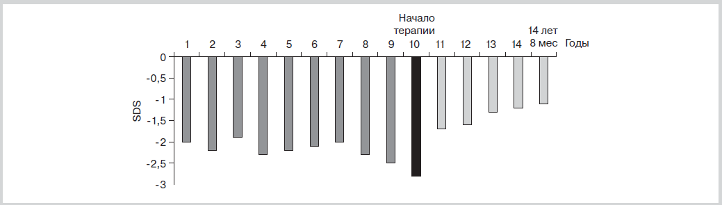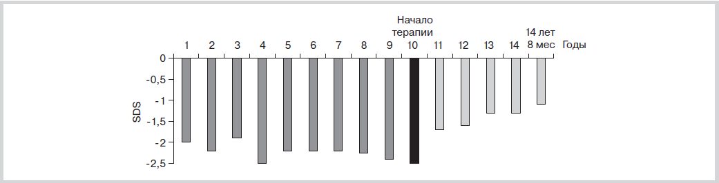 Начиная с 10 лет, обе сестры получали ГР в дозе 0,033 мг/кг/сут. Выраженный ростовой эффект наблюдался у обеих больных. Общая прибавка в росте у каждой из сестер — 30 см за 4 года. С началом лечения ГР отмечалась положительная динамика изменений SDS роста. При соблюдении только безглютеновой диеты изменение показателей SDS отсутствовало (рис. 1, 2).