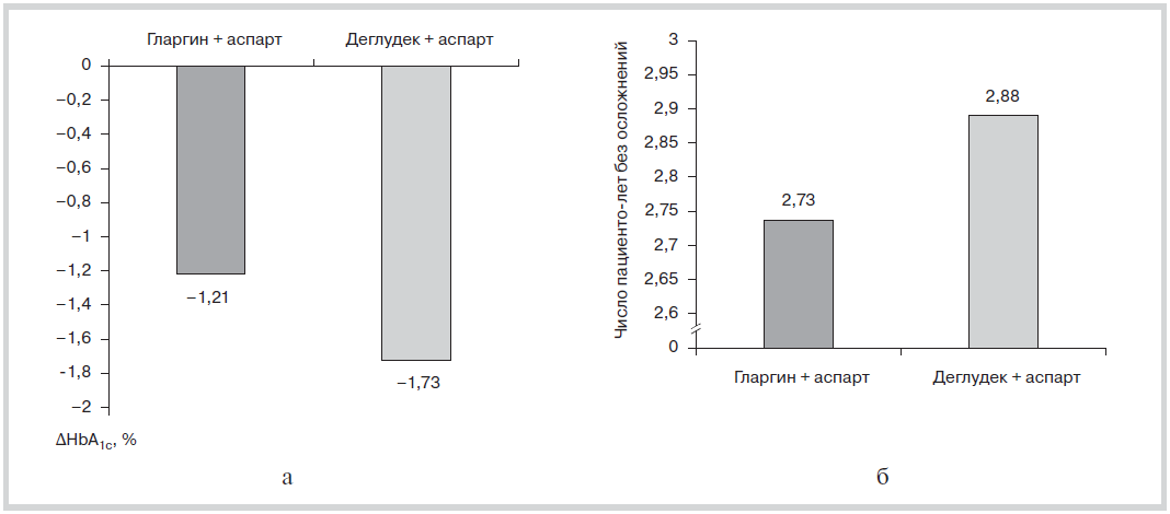 2. Рис. 2. Сравнительная эффективность базис-болюсной терапии с использованием инсулинов гларгин и деглудек при СД2. | |