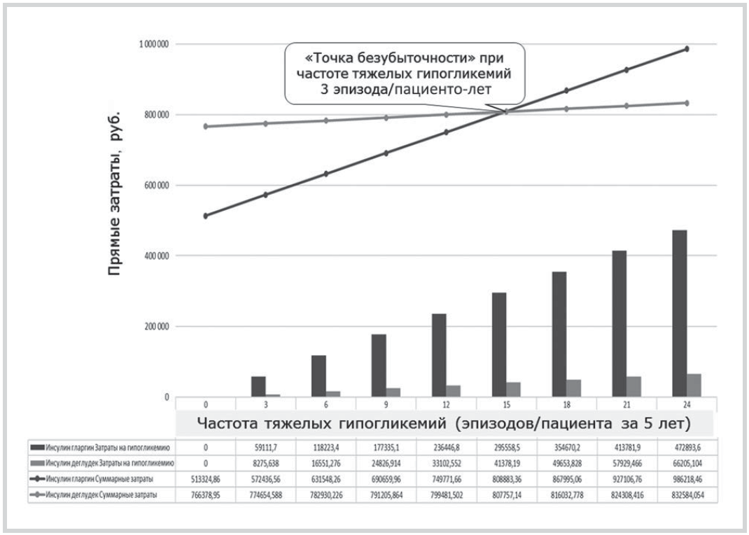 Результаты. При горизонте моделирования 5 лет суммарные ПЗ на лечение СД2 с использованием деглудека составили 783 789 руб./пациента (из них 68% — расходы на инсулинотерапию), гларгина — 730 805 руб./пациента (из них 62,58% — затраты лечение тяжелых гипогликемий и осложнений). При этом деглудек обладает более высокой эффективностью: дополнительно снижает HbA1c на 0,52%, уменьшает частоту тяжелых гипогликемий и увеличивает количество пациенто-лет без осложнений. Инкрементальные затраты ICER с использованием деглудека составили 101 236 руб./пациента (при оценке эффективности по снижению HbA1c) и 353 224 руб./пациента (с точки зрения увеличения числа пациенто-лет без осложнений), что соответственно в 14,3 и 4,1 раза ниже порога готовности общества платить. Дополнительный анализ затрат в зависимости от частоты тяжелой гипогликемии показал, что суммарные ПЗ с использованием деглудека при частоте гипогликемий 3 события/пациента-год на 5% меньше, а при частоте гипогликемий >3 событий/пациента-год — на 23% меньше, чем при использовании гларгина.