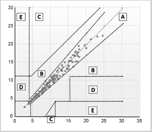 Рис. 4. Оценка клинической безопасности (номограмма Паркс) результатов измерений глюкометра «Глюкокард Сигма».