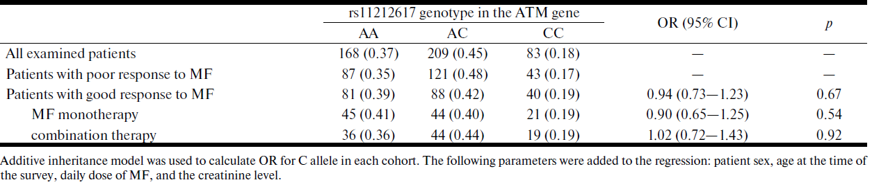 Логистический регрессионный анализ зависимости достижения целевого HbA1с <7% при терапии МФ от генотипов полиморфного локуса rs11212617 гена ATM не выявил статистически значимой ассоциации генотипа полиморфного локуса rs11212617 с типом ответа как в общей группе пациентов (OR=0,94; 95% CI 0,73—1,23; p=0,67), так и в подгруппах пациентов с монотерапией МФ (OR=0,90; 95% CI 0,65—1,25; p=0,54) и комбинированной терапией (OR=1,02; 95% CI 0,72—1,43; p=0,92) (табл. 2).
