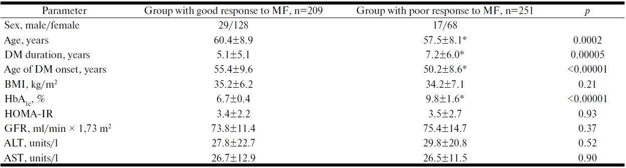 При анализе клинических данных пациенты группы с плохим ответом на МФ по сравнению с группой с хорошим ответом на МФ были моложе (57,5±8,1 года против 60,4±8,9 года; р<0,05), имели большую длительность заболевания (7,2±6,0 года против 5,1±5,1 года; р<0,05), более высокий уровень HbA1c (9,8±1,6% против 6,7±0,4%; р<0,05), более молодой возраст начала заболевания (50,2±8,6 года против 55,4±9,6 года; р<0,05) и статистически значимо не различались по ИМТ, степени инсулинорезистентности, скорости клубочковой фильтрации (СКФ) и уровню трансаминаз (табл. 1).