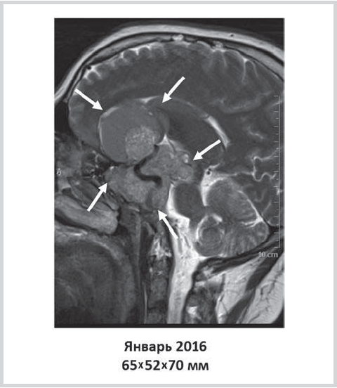 The lack of an adequate treatment led to the progressive growth of prolactinoma from 44 to 70 mm in size for the period of 8 years. It is known that surgical treatment with transsphenoidal or transcranial access and radiotherapy are not relevant in macroprolactinomas [2, 4, 12—14]. Usually, surgery is indicated for patients with the signs of severe chiasmal compression or in case of ineffectiveness/intolerance of dopamine agonist therapy. In a study by I. Shimon et al., surgical intervention was performed in 50% of patients and did not lead to the disease remission in any of the cases [6]. Complications of the surgical treatment were ophthalmoplegia and the development of panhypopituitarism, including diabetes insipidus. It should be noted that, in some cases, when therapy with dopamine agonists was found to be ineffective, cabergoline therapy against cytoreduction led to normalization of prolactin level in patients. The role of radiation therapy in prolactinomas is currently limited. Normalization of prolactin level is observed in about one third of the patients who underwent radiation therapy; the period of restoration of normal prolactin level can take up to 20 years [14]. Side effects of radiation therapy are panhypopituitarism, injured cranial nerves and, rarely, the development of secondary tumors [14]. In accordance with modern recommendations, radiation therapy is an emergency approach in patients with aggressive and/or malignant prolactinomas, in whom medical and surgical treatment has proved to be ineffective [2].