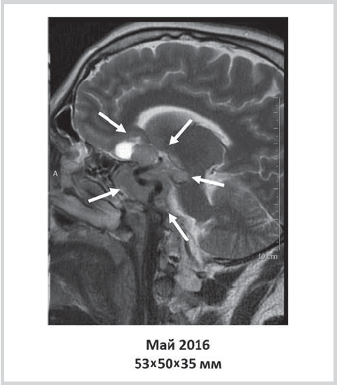 Six months after initiation of the therapy with dopamine agonists, the patient reported a decrease in headache and a significant improvement in the overall well-being. According to the brain MRI, there was a positive trend in the form of a decreased size of the formation to 53×50×35 mm (fig. 2).