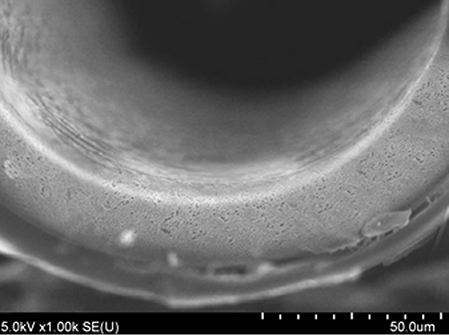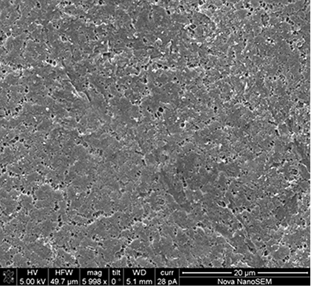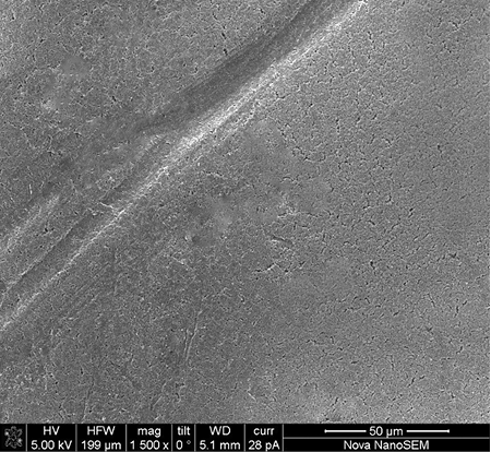 Первичная микроскопическая оценка. Для получения контрольных данных осушенные под вакуумом исходные образцы покрытых мембран исследовали методом электронной микроскопии. Образцы напылялись вольфрамом толщиной 20—25 нм на установке для ионного напыления Cressington 208HR. Микрофотографии выполнены на сканирующем электронном микроскопе Nova NanoSEM (FEI, США).