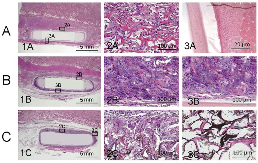 Проведенный через 90 дней после имплантации гистологический анализ показал отсутствие некроза и некротических изменений в окружающих все образцы тканях.
