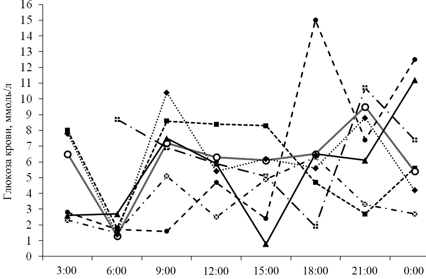 2. Рис. 2. Суточные колебания гликемии в течение нескольких дней.