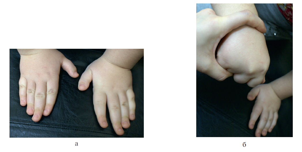 12. Рис. 11. Пороки развития кистей при ПГП. а — внешний вид кистей с брахидактилией; б — отсутствие видимых IV, V фаланго-пяcтных суставов при сжатии кисти в кулак.