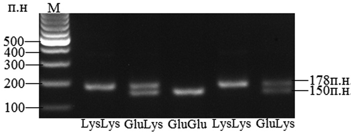 Генотип Glu/Glu — 150+32+28 п.н.; генотип Lys/Lys — 178+32 п.н.; генотип Glu/Lys — 178+150+32+28 п.н. Фрагменты длиной 32 и 28 п.н. не видны из-за низкого молекулярного веса. М — маркер молекулярной массы ДНК.