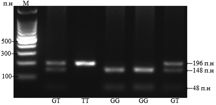 Генотип GG — фрагмент ДНК размером 148 и 48 п.н., гетерозиготный генотип GT —196, 148 и 48 п.н., генотип TT — 196 п.н.