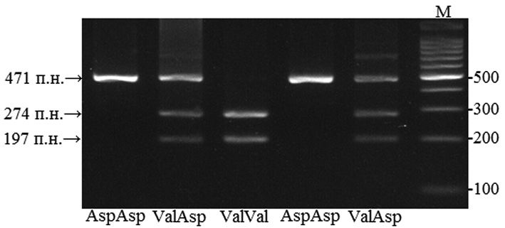 Генотип Val/Val — 274, 197 п.н.; генотип Asp/Asp — 471 п.н.; гетерозиготный генотип Val/Asp — 471, 274, 197 п.н. М — маркер молекулярной массы ДНК.