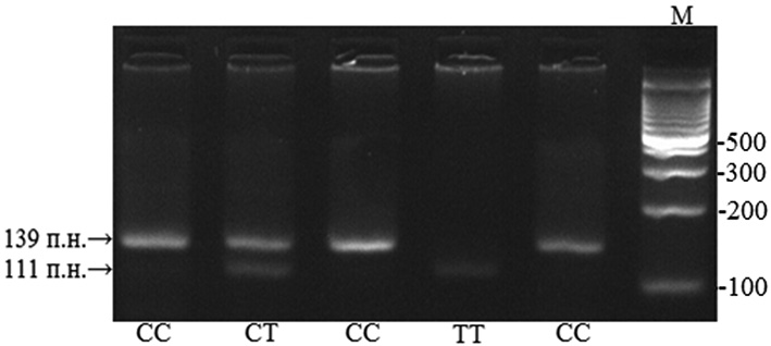 CC — гомозигота дикий тип 139 п.н.; CT — гетерозиготный генотип 139+111п.н.; TT — гомозигота мутантный тип 111 п.н.